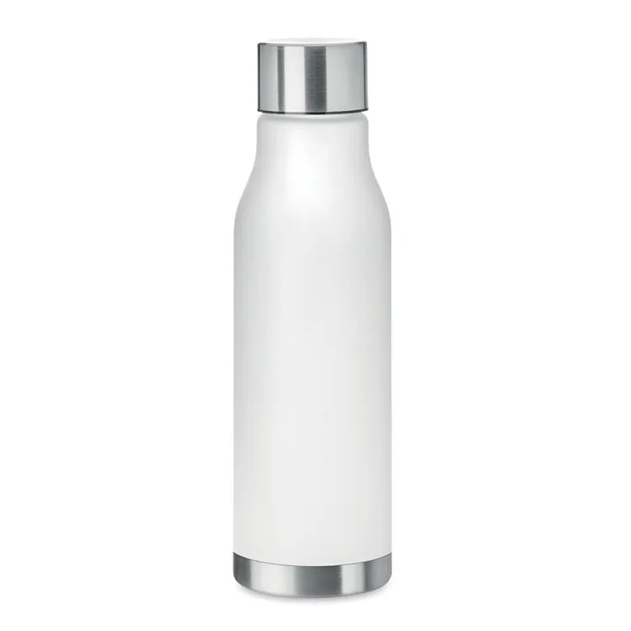 Bočica za piće od RPET-a s gumiranom završnom obradom (zamagljeno prozirna) i čepom od nehrđajućeg čelika s unutarnjim RPET poklopcem i silikonskim prstenom. Bez BPA. Ne propušta. Kapacitet: 600 ml. Nije pogodna za gazirana pića.