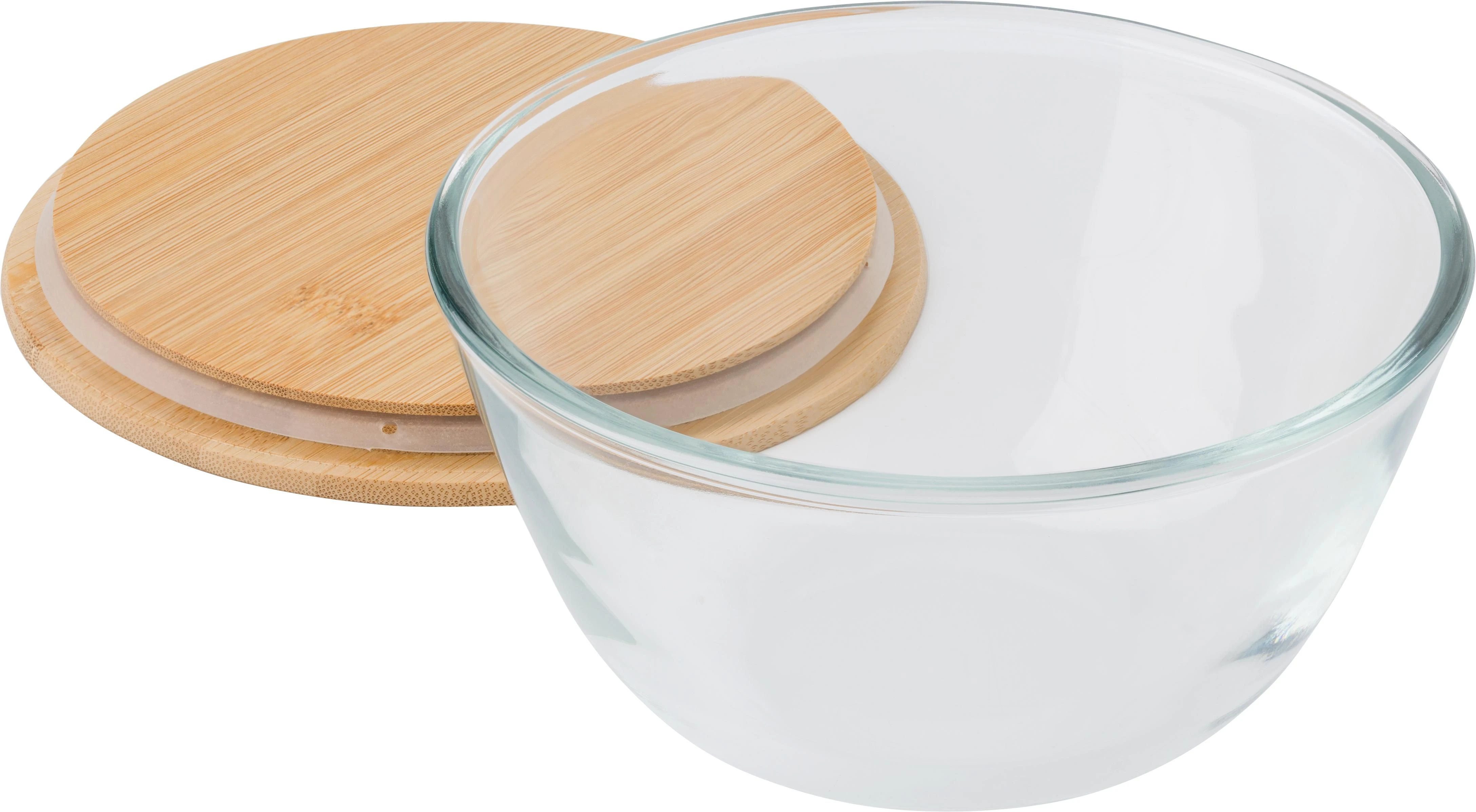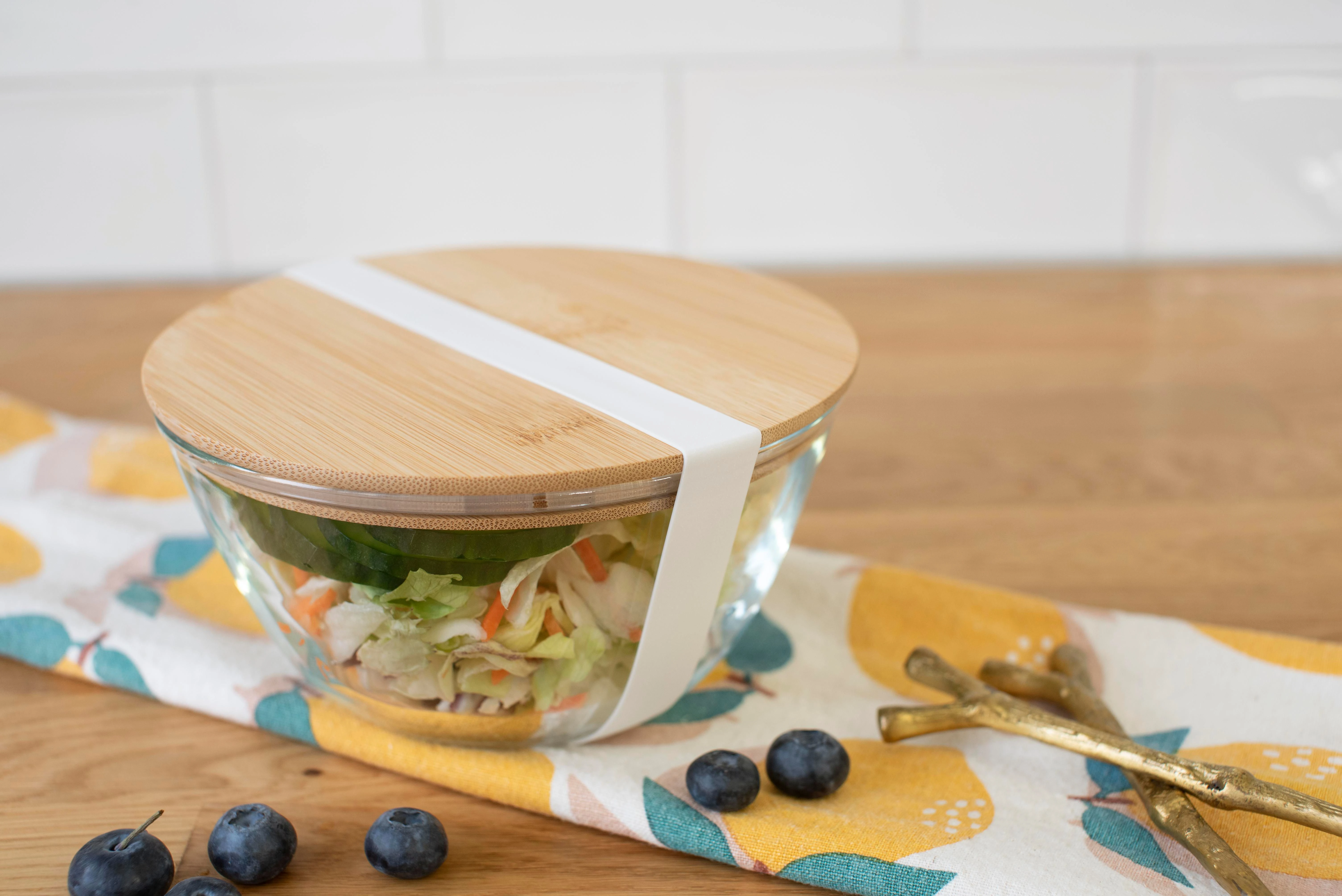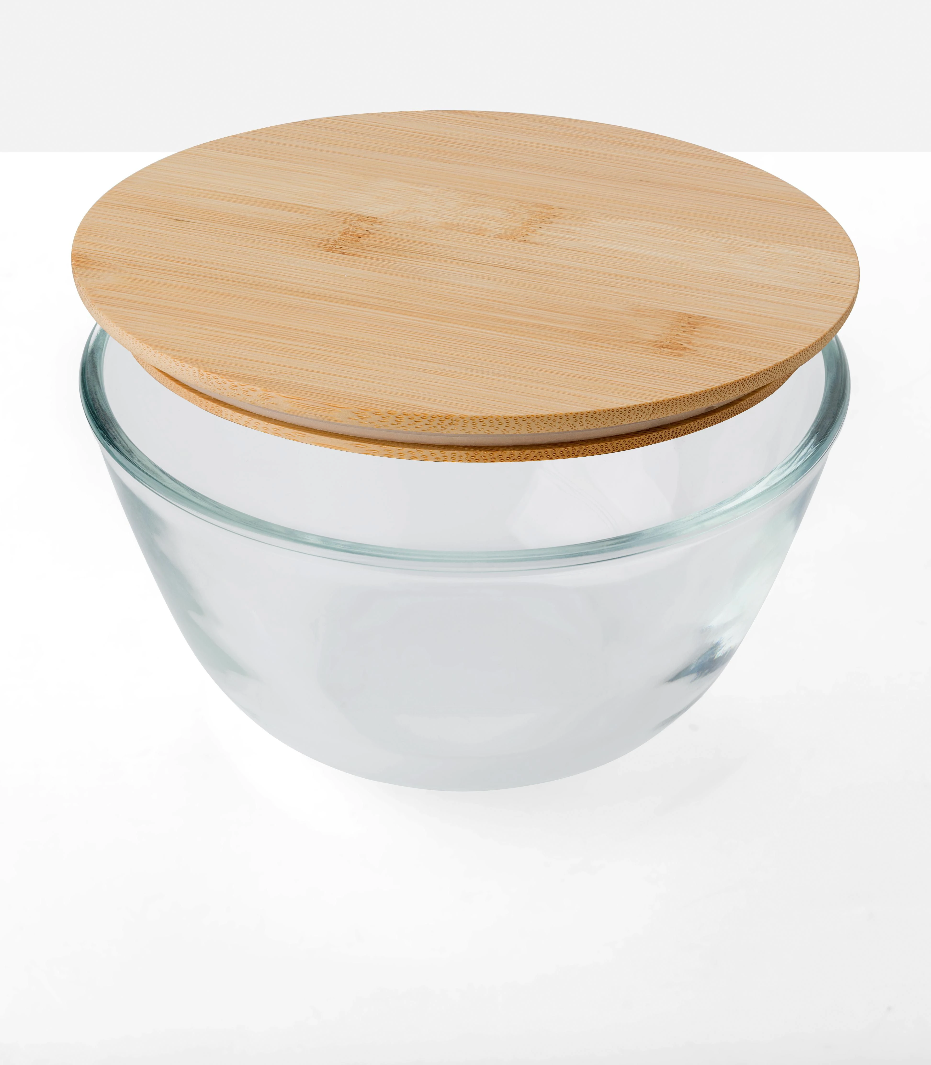 Staklena zdjela za salatu s bambusovim poklopcem i silikonskom trakom za zatvaranje kapacitet 1200 ml posebno ojačano borosilikatno staklo tanko ali čvrsto pojedinačno pakirano u smeđu kartonsku kutiju