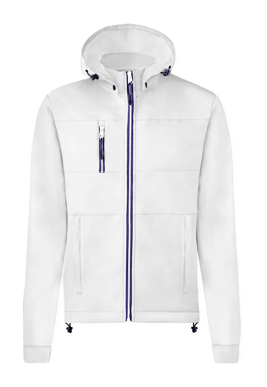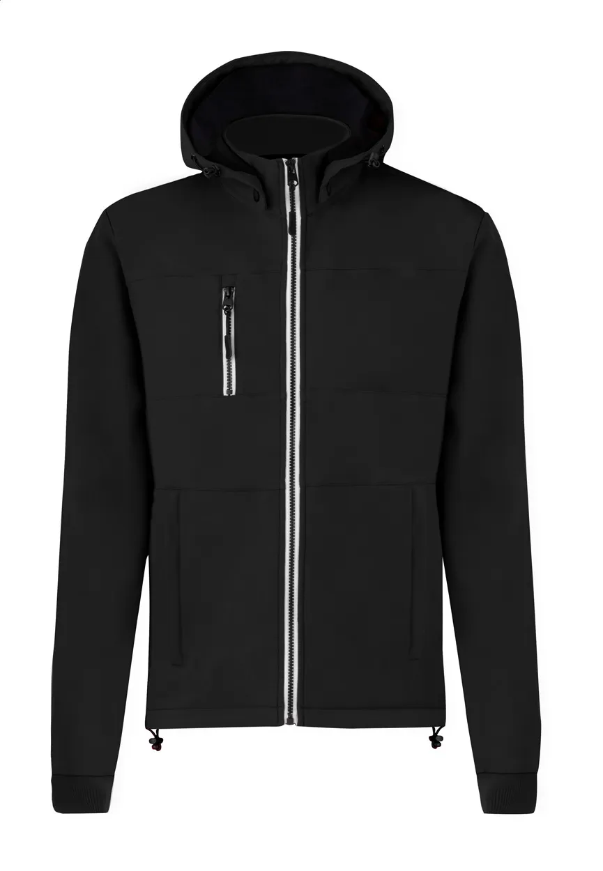 €61.06Vjetrovsta i vodootporna softshell jakna s patentnim zatvaračem, 2 bočna džepa, 1 prednji džep, stojećom kragnom i odvojivom kapuljačom. 100% poliester, 300 g/m².