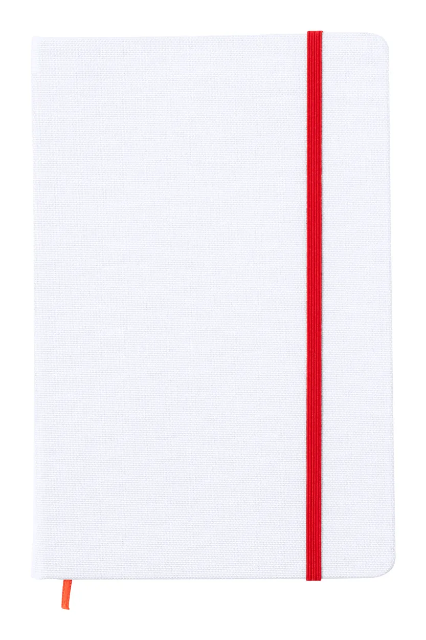 Bilježnica s koricama od 600D RPET poliestera, 100 praznih listova, gumicom u boji i oznakom stranice, format A5, pogodna za sublimacijski tisak