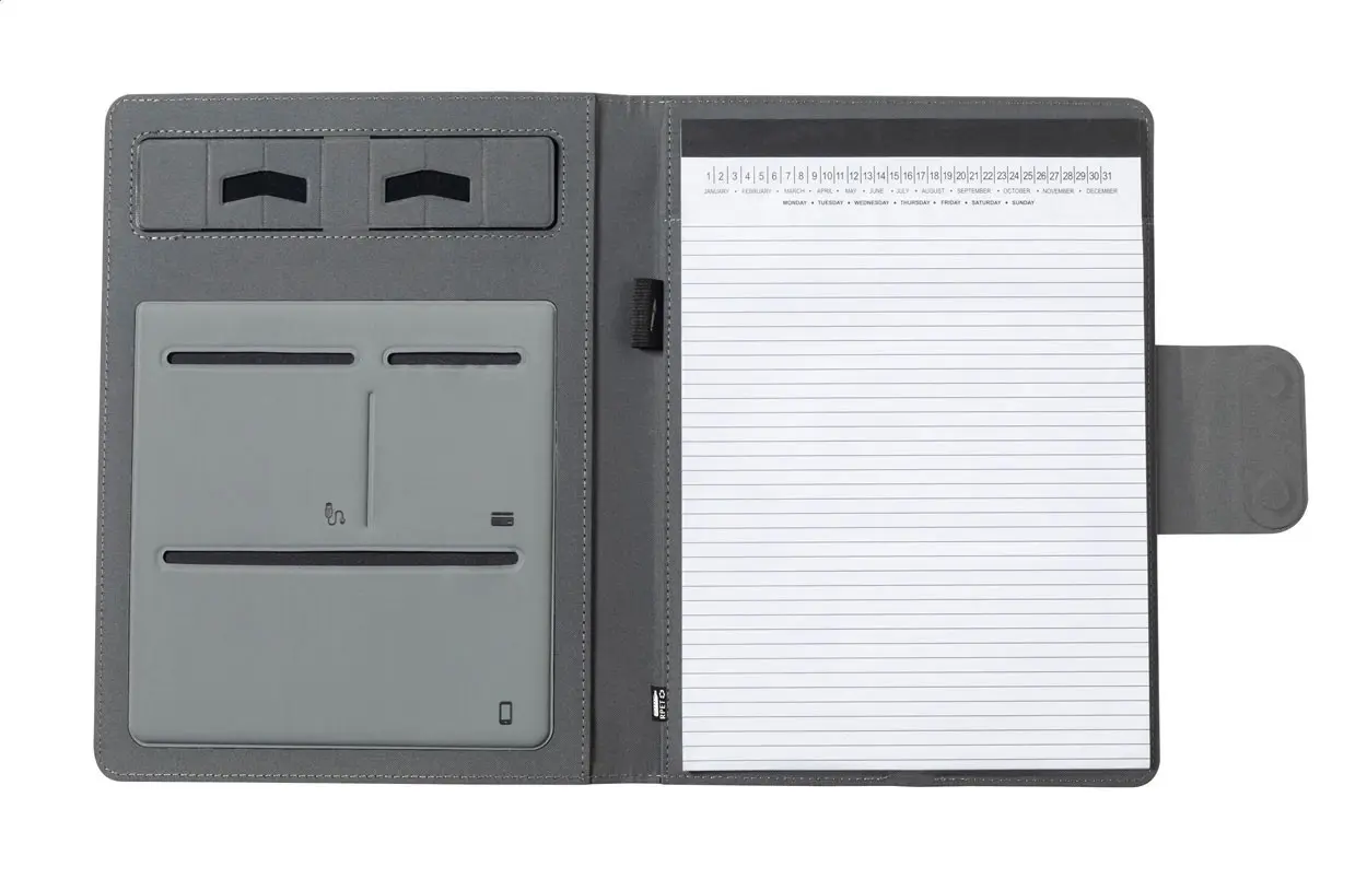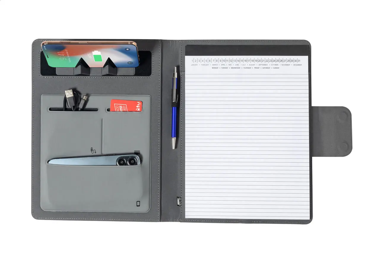 €122.39Mapa za dokumente formata A4 od 300D RPET poliestera s ugrađenim magnetskim bežičnim brzim punjačem (10W), powerbankom od 5000 mAh s USB priključkom za punjenje, preklopnim držačem za mobitel i blokom od 20 liniranih listova, uključuje samoljepljivi metalni prsten za korištenje magnetske funkcije na bilo kojem uređaju s bežičnim punjenjem, uključuje USB kabel za punjenje