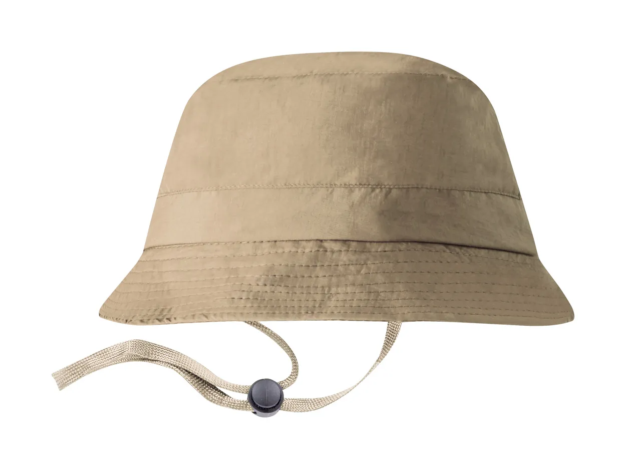 Sklopivi ribolovni šešir od mikrovlakana s vezicom za vrat i gumbom za zatvaranje.