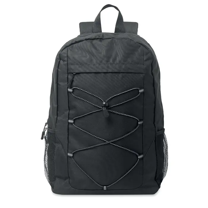 €4.37Ruksak od 600D RPET poliestera s dekorativnom vezicom i prednjim panelom s patentnim zatvaračem. Mrežasti džepovi s obje strane.
