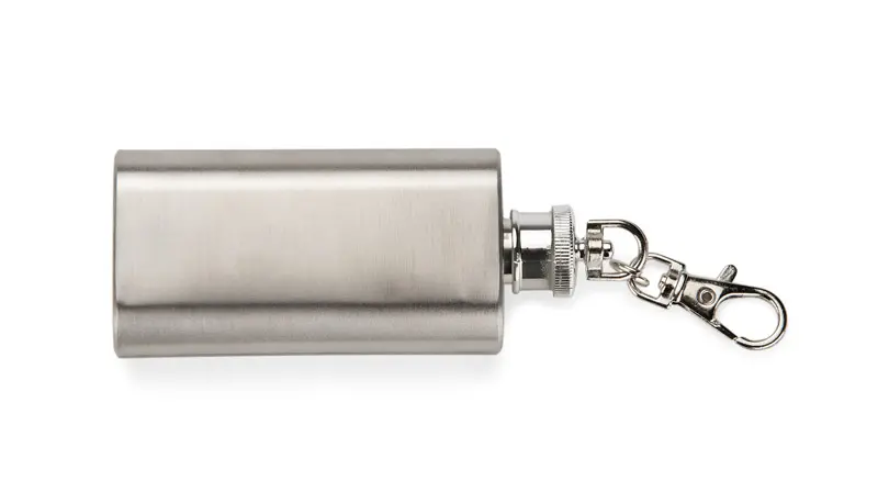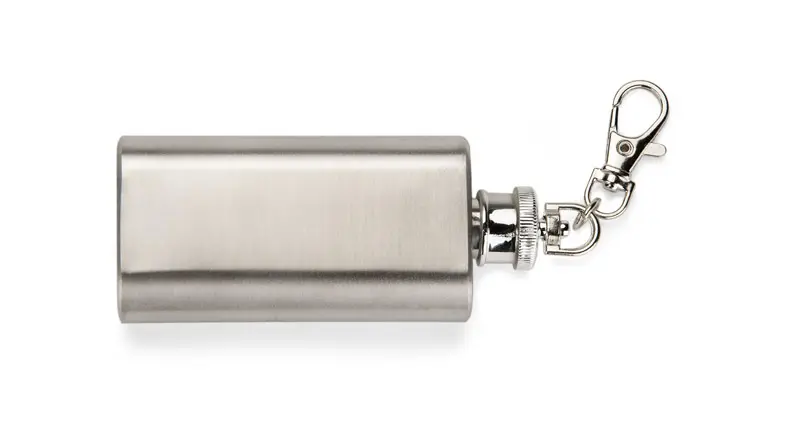 €3.42FLASIK privjesak za ključeve s pljoskom od nehrđajućeg čelika mat završne obrade, zapremnina 50 ml, nepropusno zatvaranje, karabiner za pričvršćivanje na ključeve, ruksak ili remen