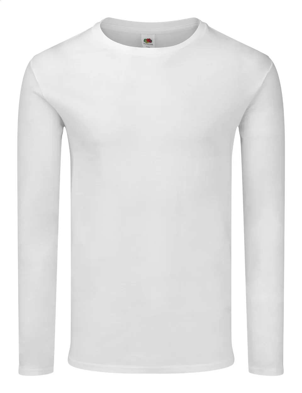 Odrasla, bijela majica s dugim rukavima i okruglim izrezom. 100% češljani prstenasto pređeni pamuk, 140 g/m². Proizvod marke Fruit of the Loom.