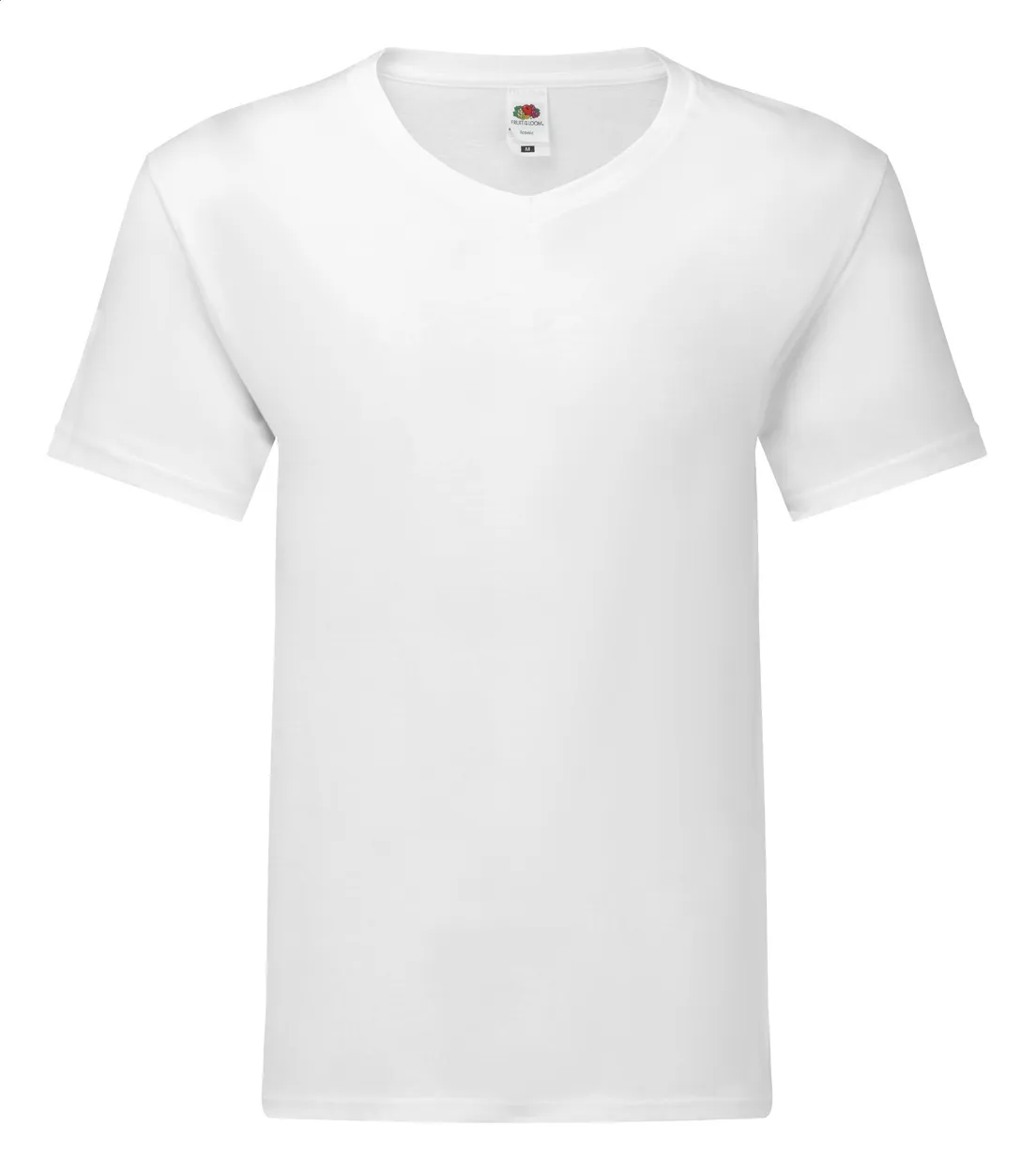 Bijela majica za odrasle s V-izrezom. 100% češljani prstenasto pređeni pamuk, 140 g/m². Proizvod marke Fruit of the Loom.