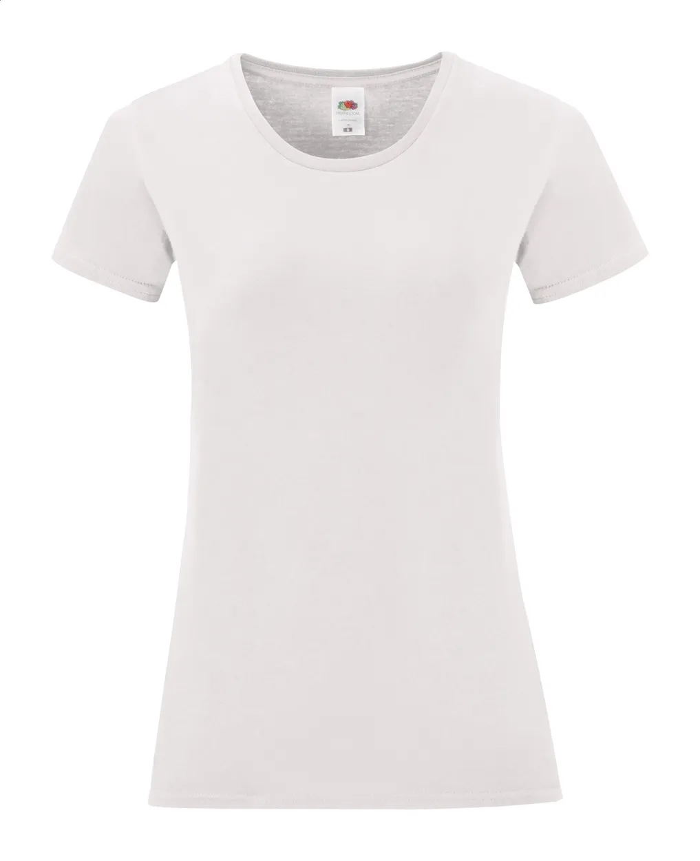 Ženska majica s okruglim izrezom u bijeloj boji. 100% češljanog prstenasto pređenog pamuka, 140 g/m². Proizvod marke Fruit of the Loom.