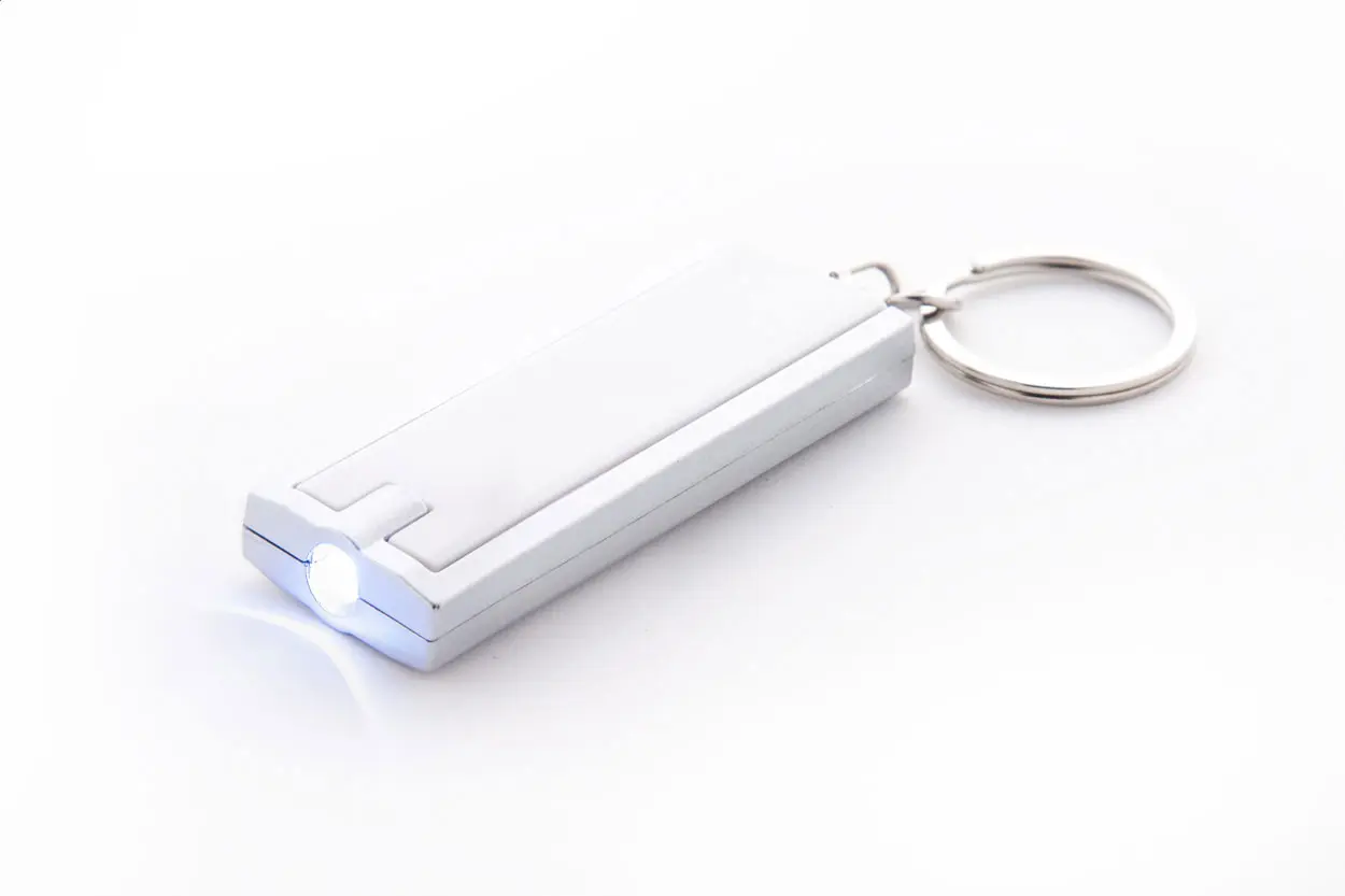 €0.93Plastični privjesak za ključeve s LED svjetiljkom i metalnim prstenom za ključeve. Uključuje baterije tipa gumb.