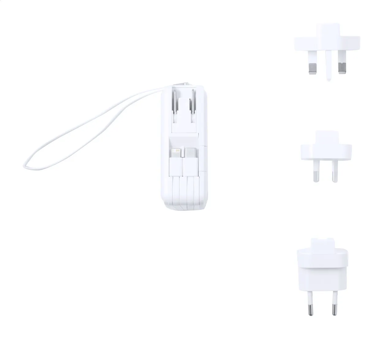 Višenamjenski powerbank / putni adapter s remenom za nošenje i izmjenjivim utikačima za SAD, Europu, UK i Australiju, s baterijom od 10000 mAh, ugrađenim bežičnim brzim punjačem (15W), 1 USB i 1 USB-C priključkom za punjenje