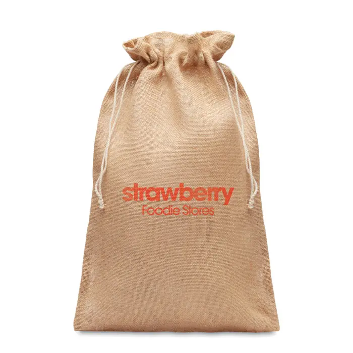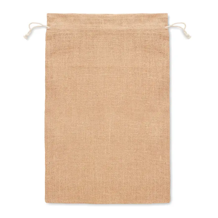 Velika poklon vrećica od jute s vezicom. Dimenzije otprilike 30x47 cm. Ovaj proizvod ima OEKO-TEX® STANDARD 100 certifikat.