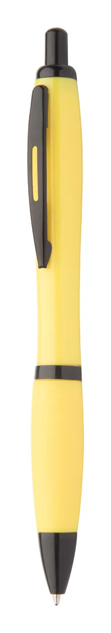 Plastična kemijska olovka s obojenim tijelom i drškom te crnim dijelovima. S crnim punjenjem.