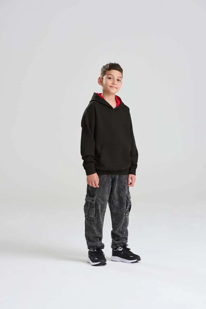 €11.1380% češljani pamuk/20% poliester, standardni kroj, dvostruki šavovi, dupla tkanina na kapuljači s kontrastnom unutrašnjosti, bez vezica (u skladu s EU regulativom), klokanski džep, brušena unutrašnjost od flisa, rebraste manšete i donji rub, odvojiva etiketa, vanjski sloj od 100% pamuka