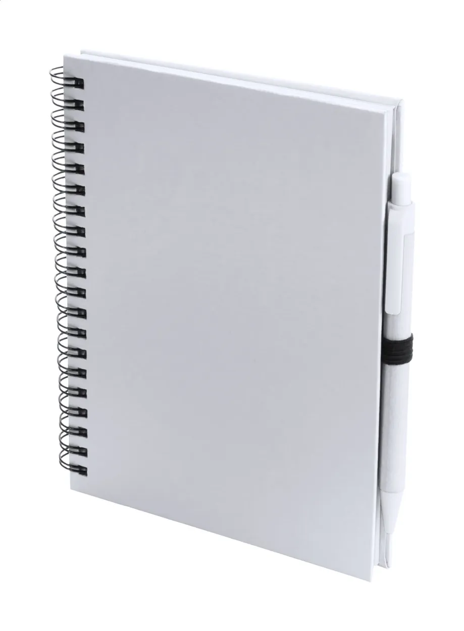 Spiralna bilježnica s kartonskom koricom i 70 praznih listova, te kemijska olovka od recikliranog papira u odgovarajućoj boji s plavim punjenjem.