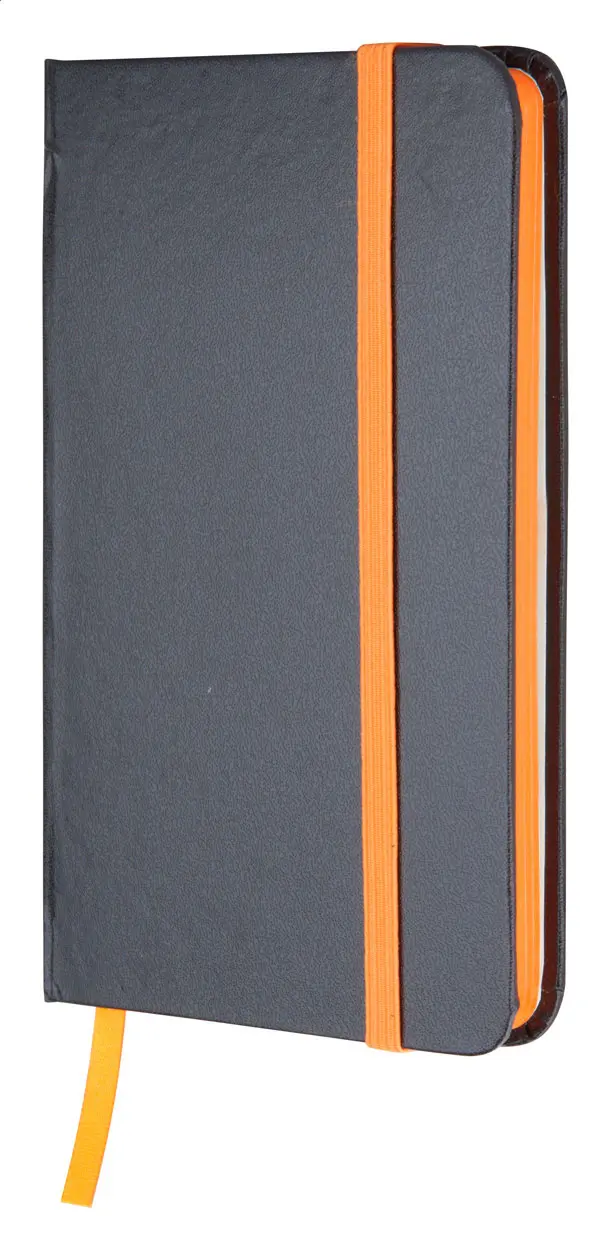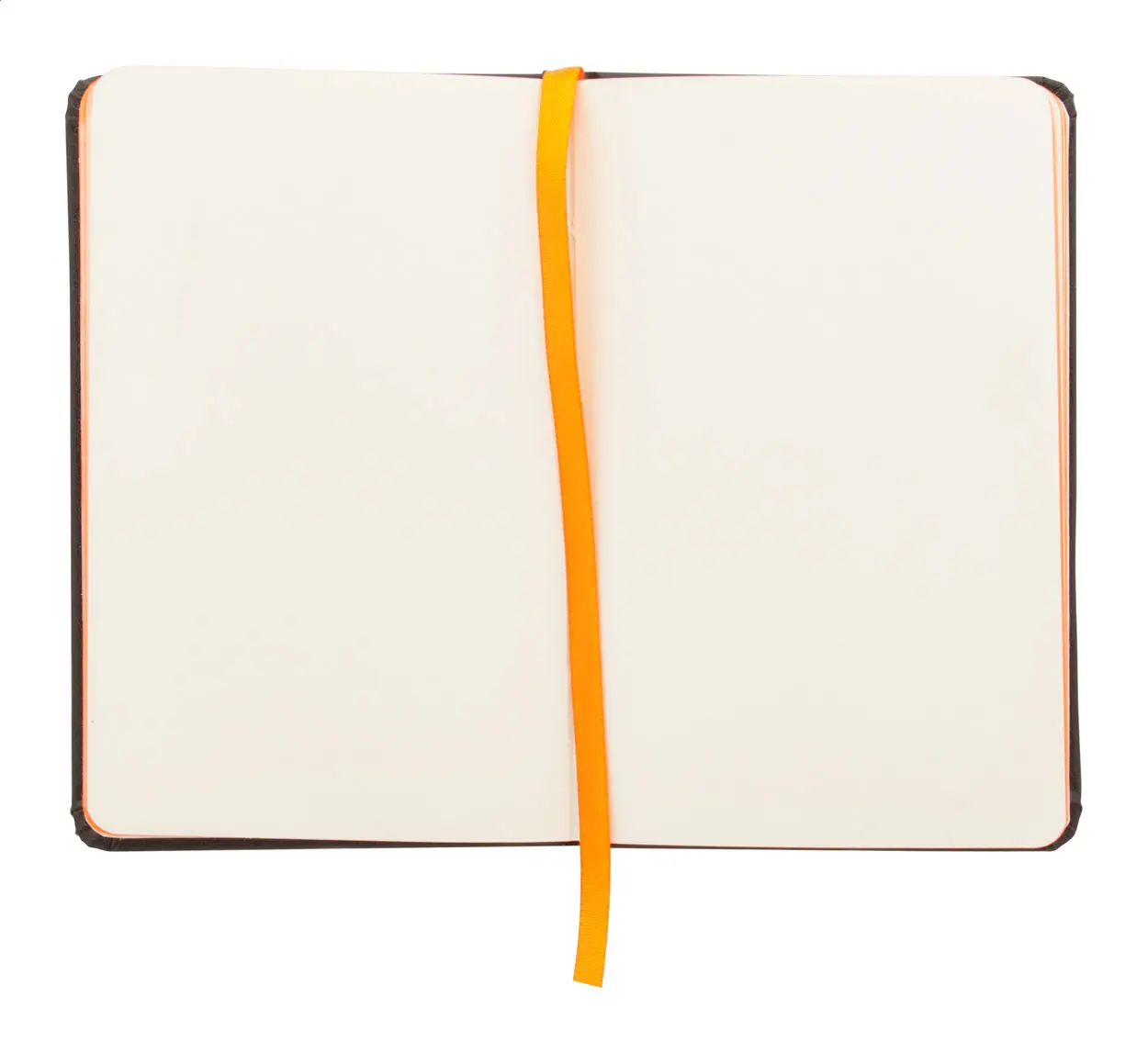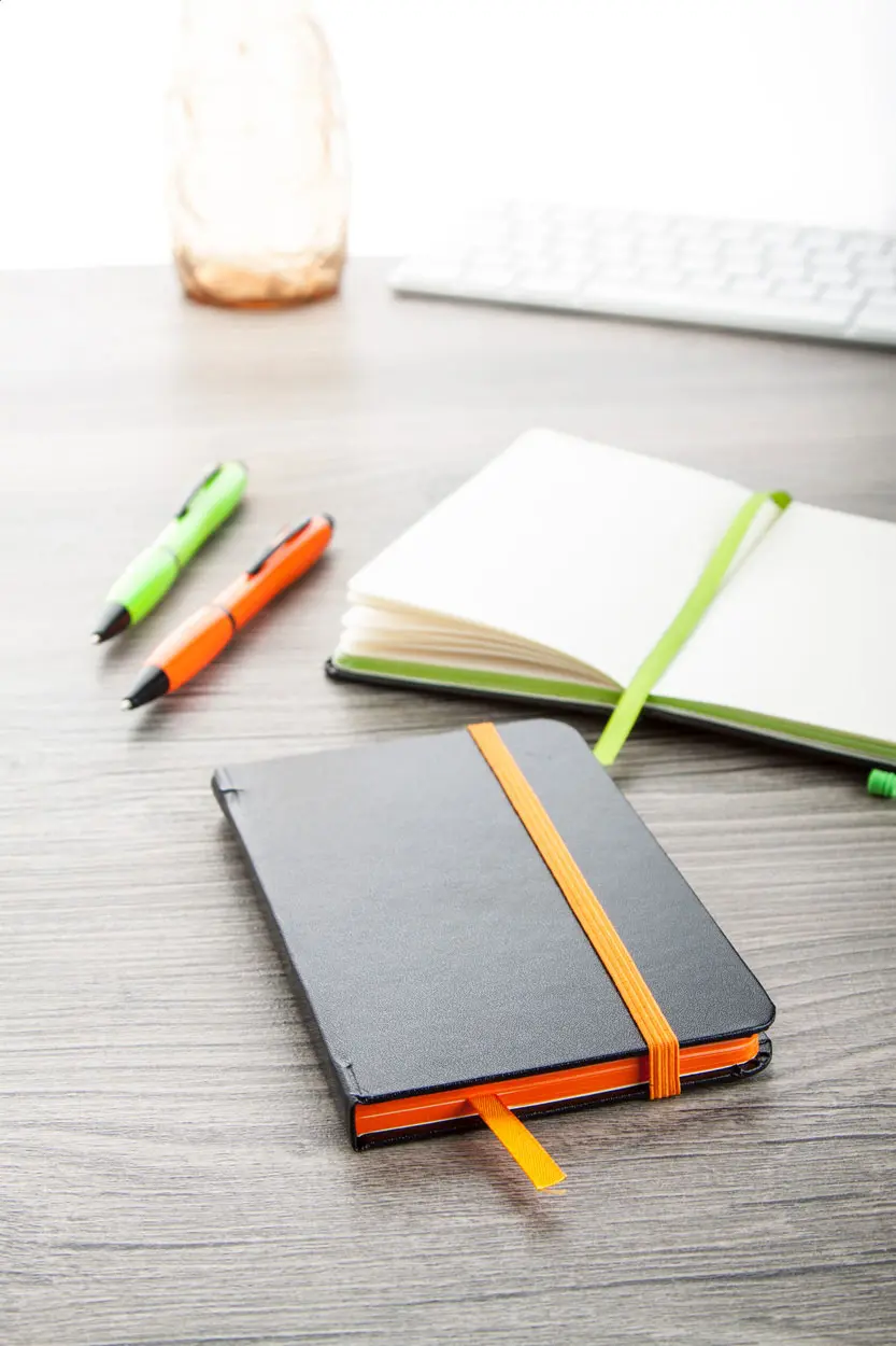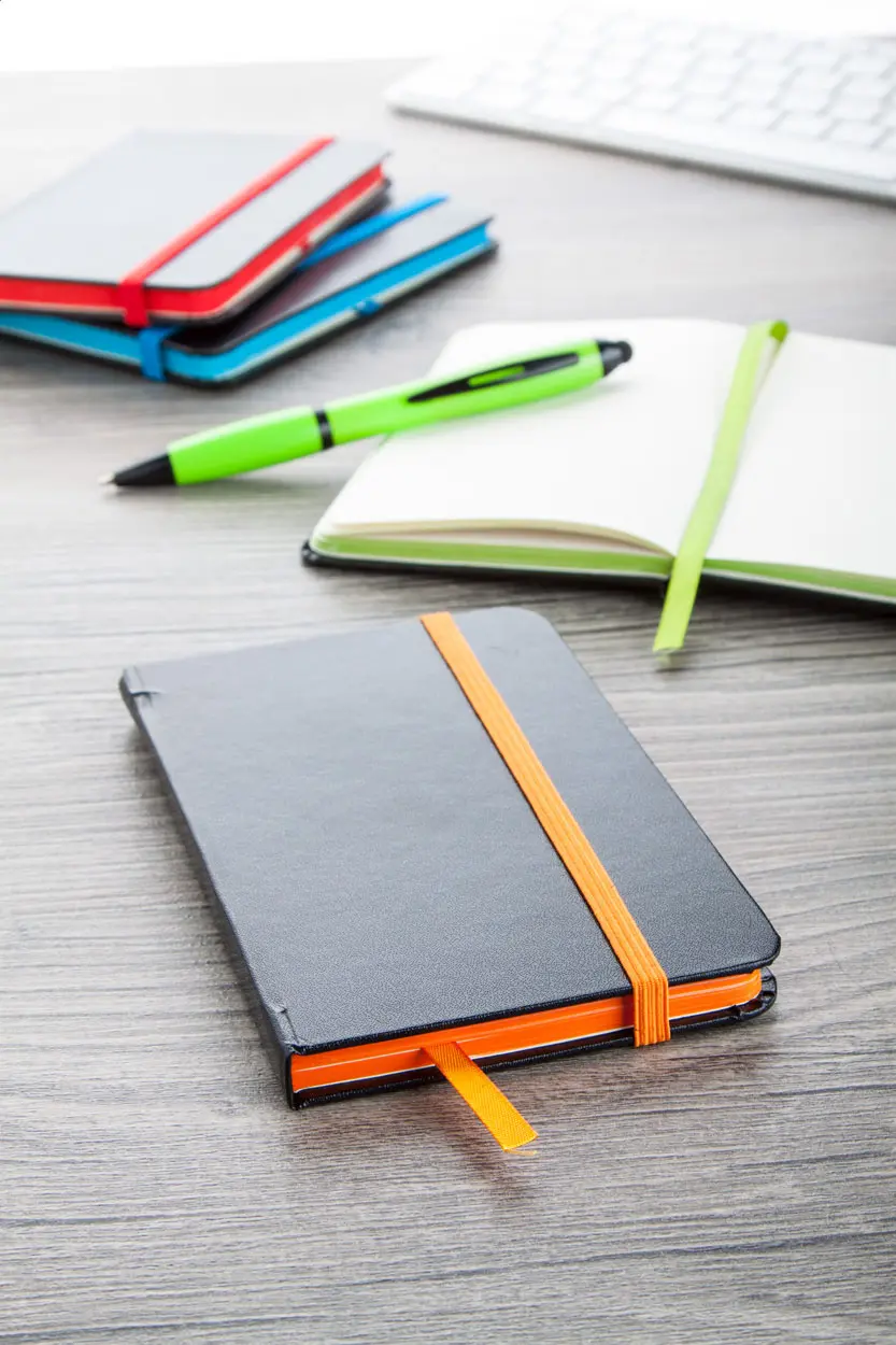 Bilježnica presvučena papirom s 80 praznih listova, oznakom za knjige i gumicom u boji koja se podudara sa stranom.