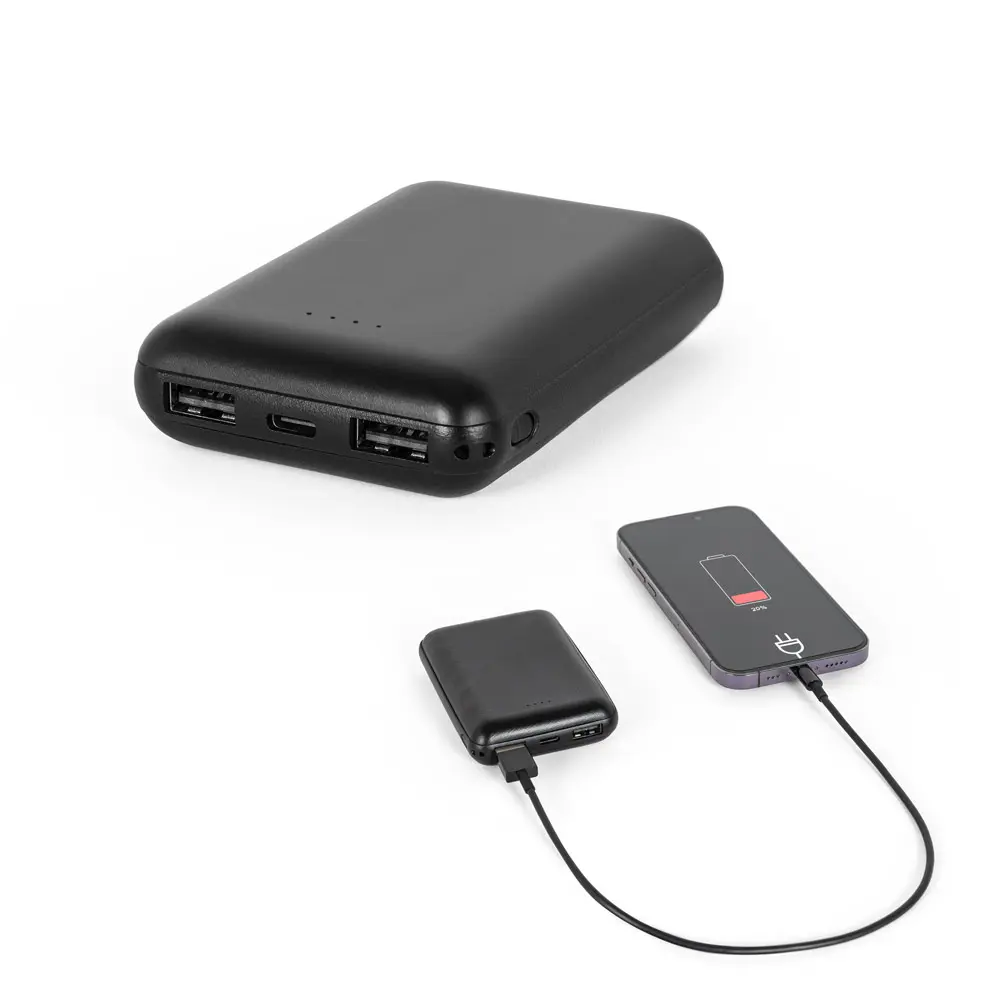 €9.50Powerbank od recikliranog ABS-a (100% rABS), prijenosna baterija kapaciteta 8.000 mAh, indikator razine napunjenosti, jedan USB-C ulaz/izlaz, jedan microUSB ulaz i dva USB-A izlaza, uključuje USB-C kabel za punjenje, isporuka u gift boxu od recikliranog kraft papira 89 x 64 x 22 mm, kutija 75 x 115 x 25 mm