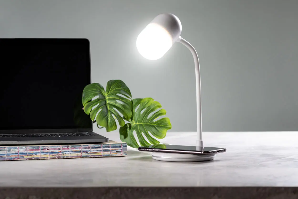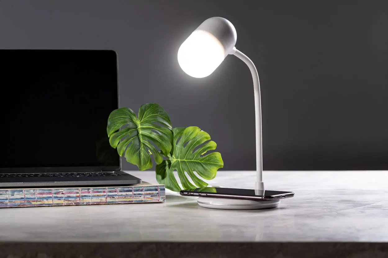 €48.95Plastična multifunkcionalna stolna svjetiljka s 14 LED dioda i 3 načina svjetla. S ugrađenim bežičnim punjačem (5W) i Bluetooth zvučnikom. Uključuje USB kabel za punjenje.