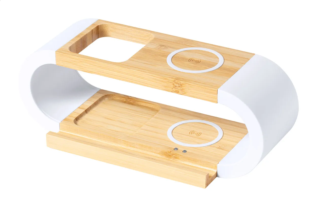 Organizator za stol i držač za mobitel od bambusa i ABS plastike s ugrađenim bežičnim punjačem (10W), USB priključak za istovremeno punjenje 2 uređaja (1 bežično i 1 putem kabela), uključuje USB-C kabel za punjenje, Limited Edition