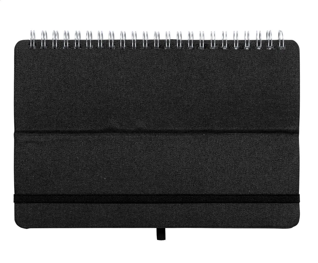 €5.89Spiralna bilježnica prekrivena 600D RPET poliesterom s umetkom za držanje mobitela i tableta od plastike od pšenične slame. Sadrži 70 obloženih listova i gumenu traku. Veličina A5.