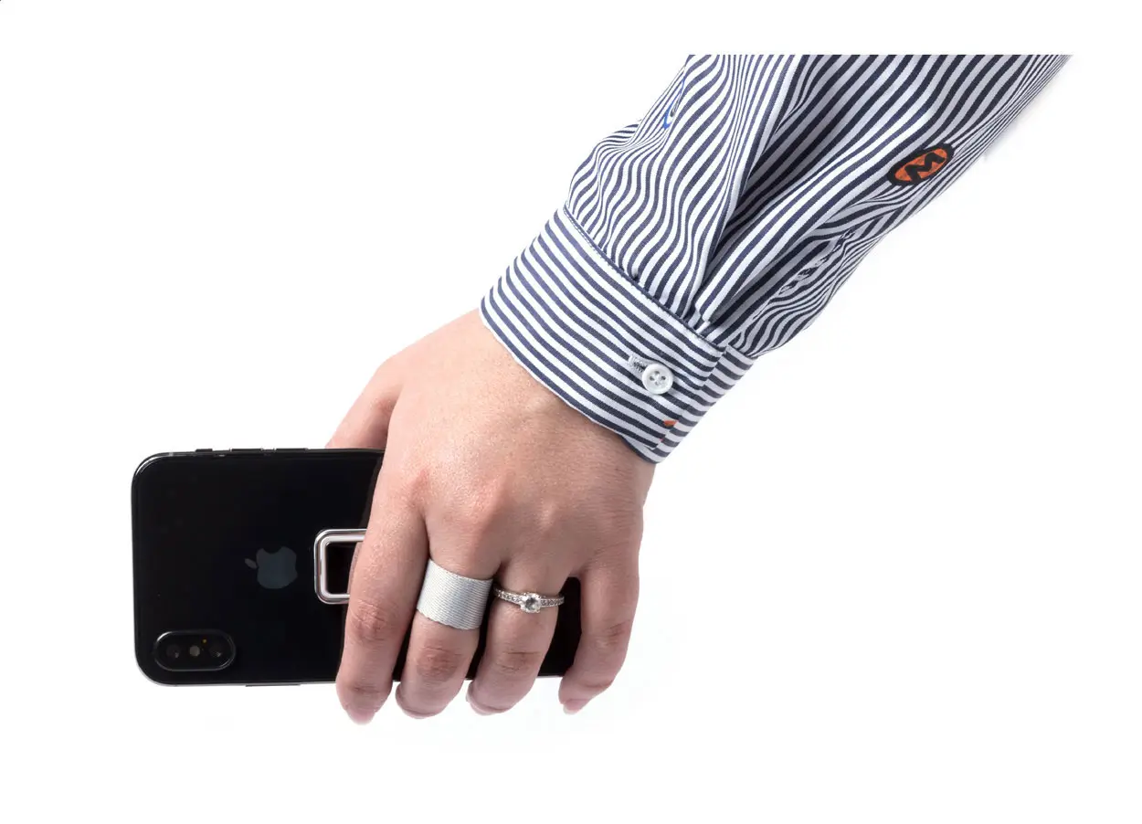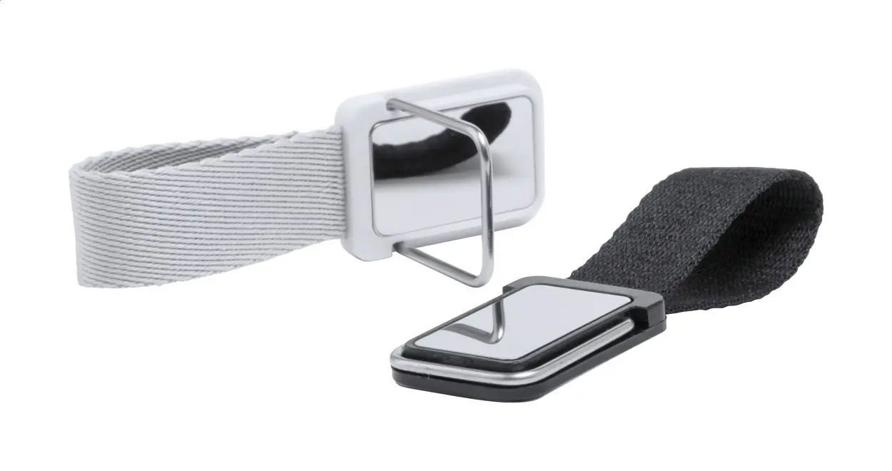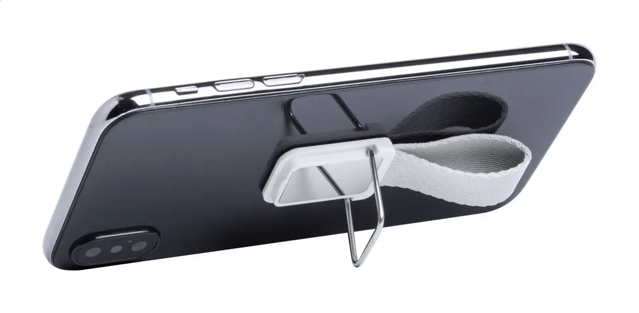 Samoljepljivi držač za mobitel od metala i plastike, s poliesterskom vezicom.