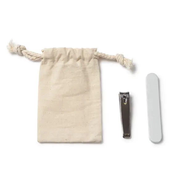 Set za manikuru u vrećici od pamuka s vezicom. Uključena turpija i klip za nokte.