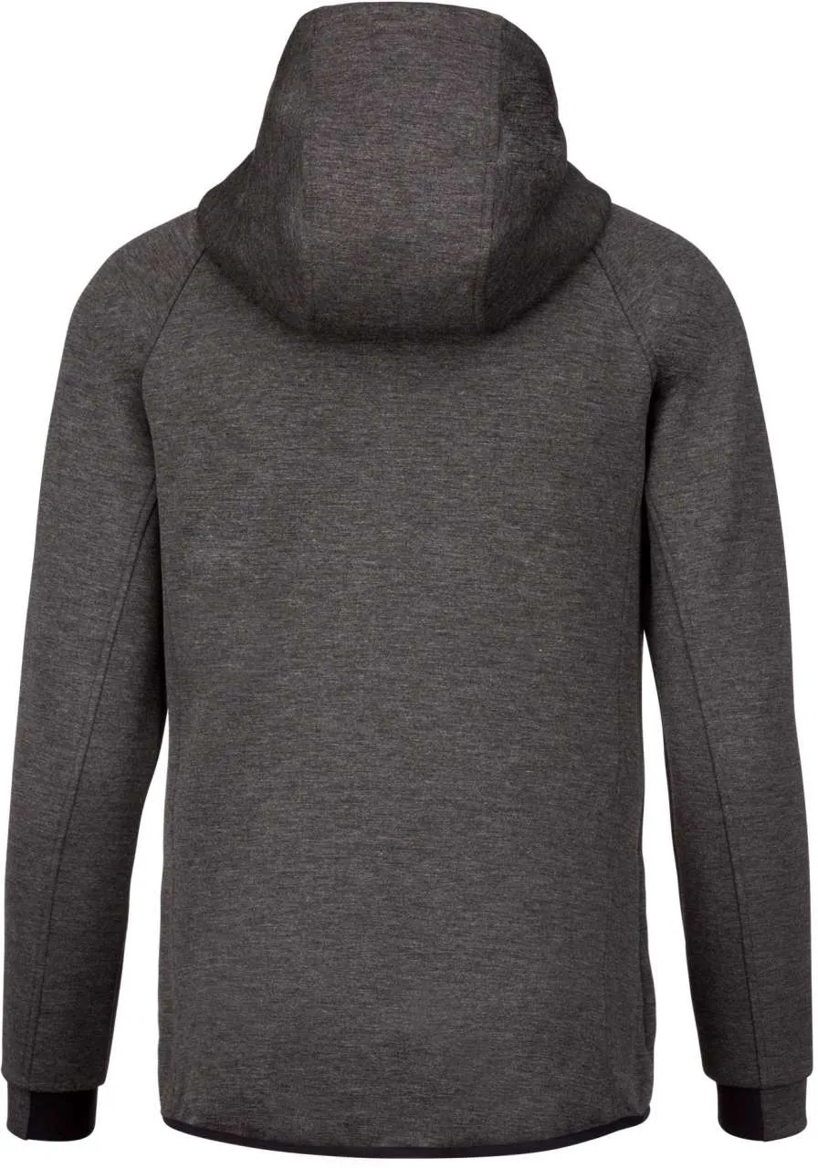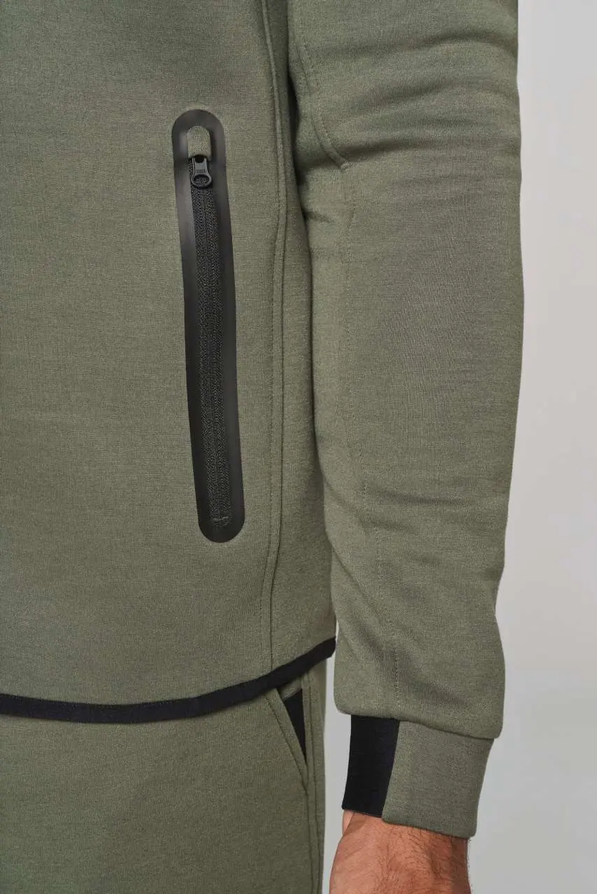 94% poliester/ 6% elastan (Heather boje 79% poliester/ 15% viskoza/ 6% elastan), iznimno udoban materijal, zatvaranje na patentni zatvarač, 2 prednja džepa sa zatvaračem i zalijepljenim šavovima, kapuljača s podstavom od 65% poliester/ 35% viskoza, i dvobojna vezica s plastičnim vrhovima, manšete s kontrastnim elastičnim dijelom, kontrastni rubovi na dnu i kontrastni zatvarači - crni na svim bojama i tamno sivi na Ash Heather.