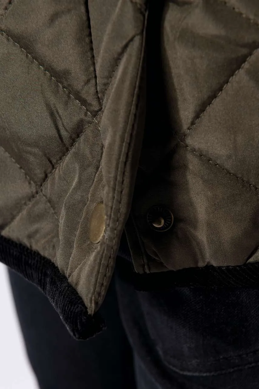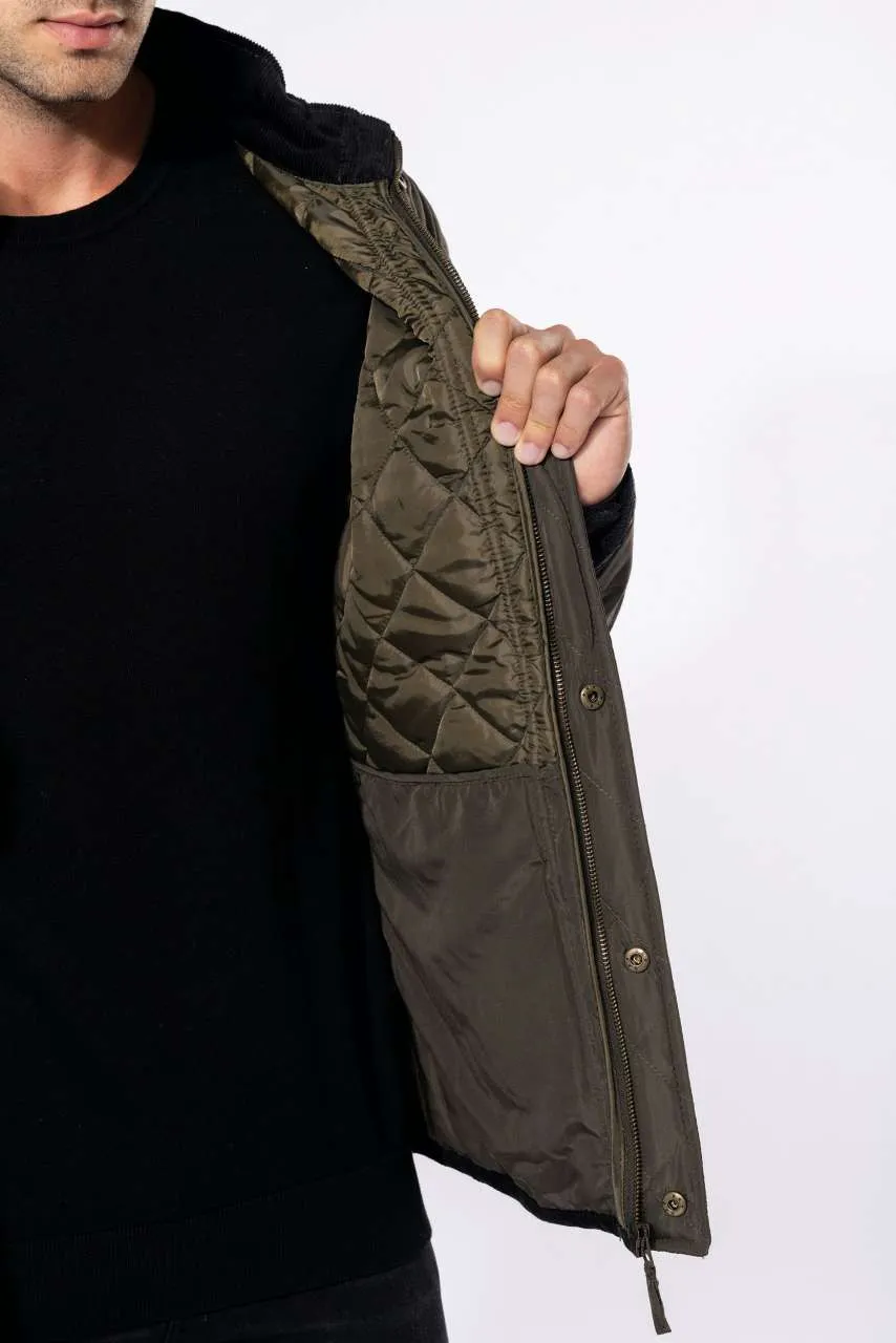 Outer: 100% polyester pongee Inner: 100 % polyester taffeta Zip fastening concealed beneath press stud placket 2 double front pockets with press stud flaps 1 inner pocket Press stud shoulder yoke Corduroy trim on cuffs, hem, elbows, inside neck and reverse side of pocket flap 2 slits with press studs at back Press studs on cuffs Certified STANDARD 100 by OEKO-TEX® N° CQ 1007/8, IFTH