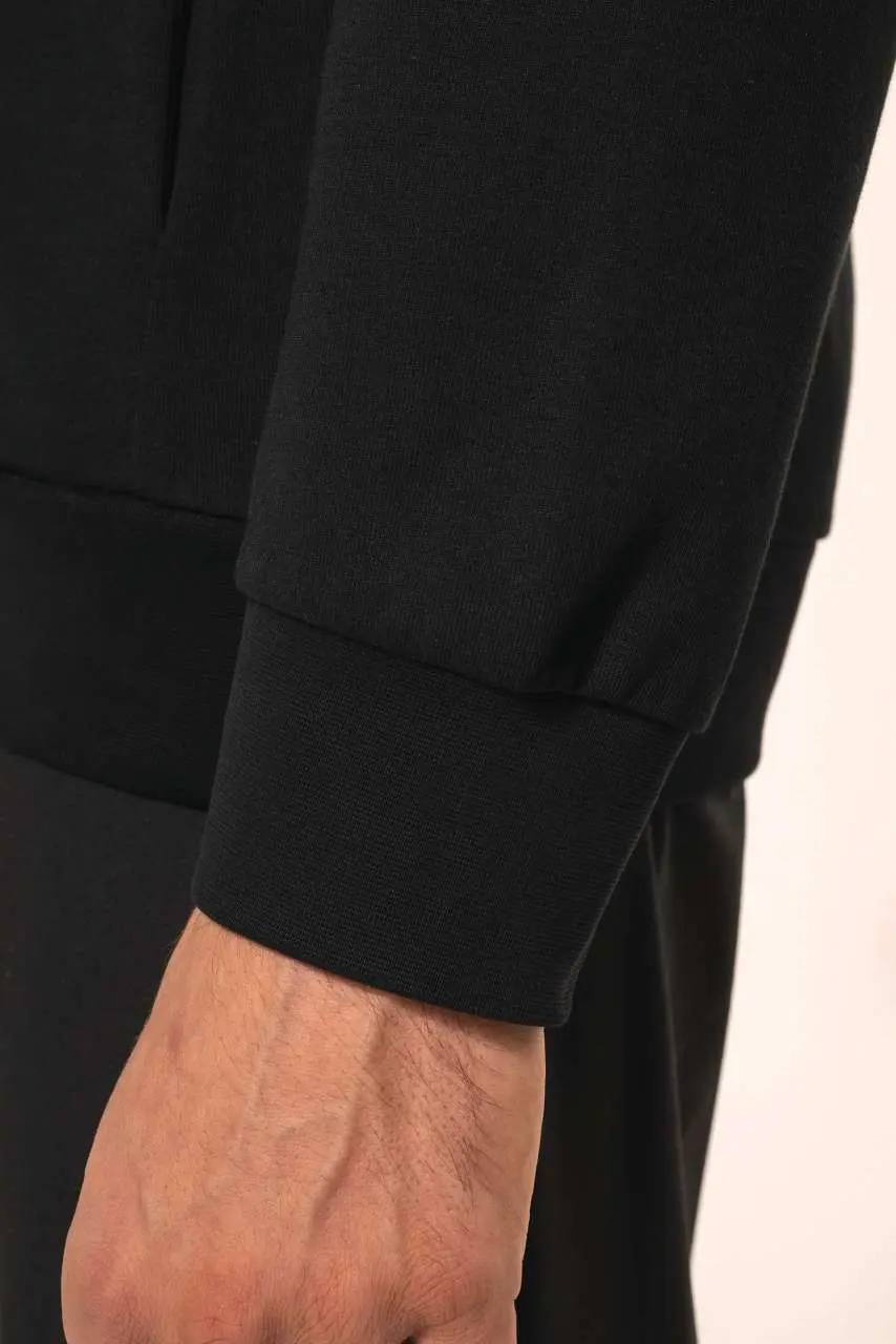 €26.4570% pamuk, 26% poliester, 4% elastan, češljani pamuk, interlock tkanina, LSI tretman (Low Shrinkage Interlock), dvodijelni kapuljača podstavljena istom tkaninom bez vezice, pojačani šavovi na vratu, traka na vratu s unutarnje strane izreza, metalni i najlonski patentni zatvarač u boji s trakom na vratu, raglan rukavi, 1x1 rebrasti rub, 2 džepa u šavu ramenog dijela, bez brend etikete, samo etiketa s veličinom radi lakšeg ukrašavanja