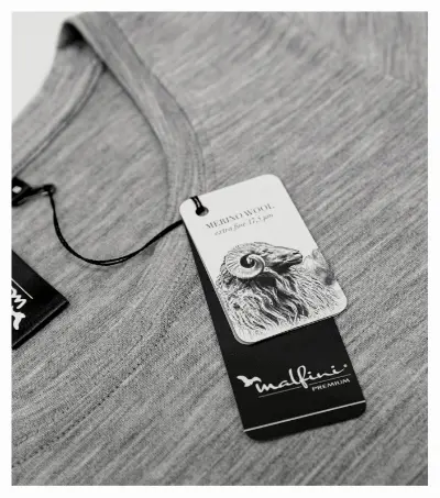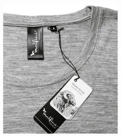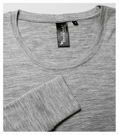 ekstra-fina merino vuna, tkanina koja se ne gužva i visoko prozračna, termoregulacijska i antibakterijska svojstva, sposobnost upijanja vlage i apsorpcije mirisa, uski kroj sa šavovima sa strane, dublji okrugli izrez, uski rub izreza izrađen od glavne tkanine, unutarnji dio stražnjeg dijela izreza s trakom od glavne tkanine, fiksirani šavovi na ramenima, dugi rukavi s manšetama, preporučuje se sušenje u vodoravnom položaju