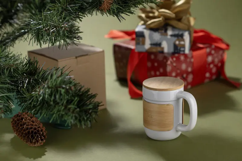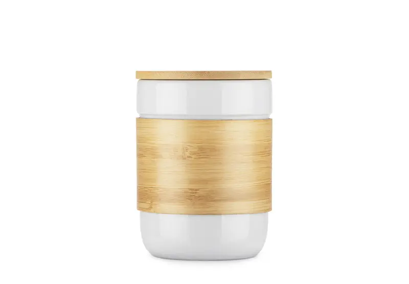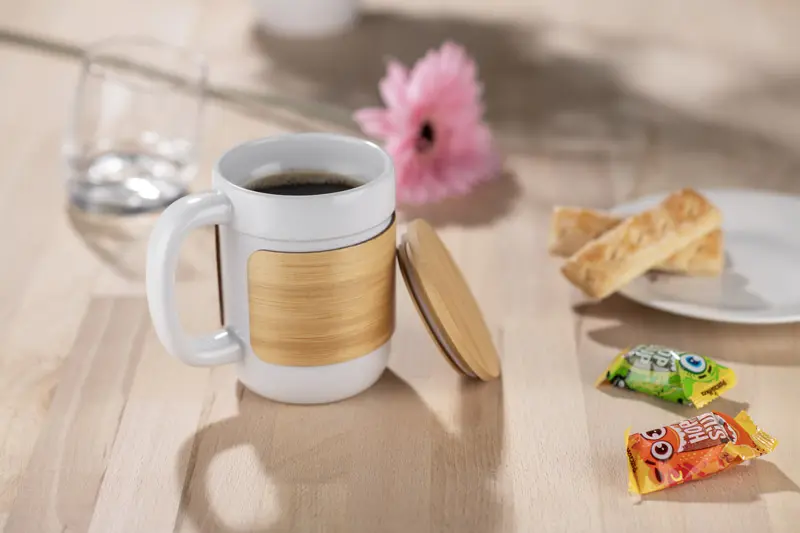The 350 ml MUGGI mug combines a classic form with modern details. Made of high-quality ceramic, it comes with a bamboo lid and a matching thermal band to protect your hands from the heat of the drink. The lid can also act as a saucer for added convenience. The natural bamboo accents give the mug a unique, pleasing look and the sturdy handle provides a comfortable grip. Perfect for the office or as part of a gift set.