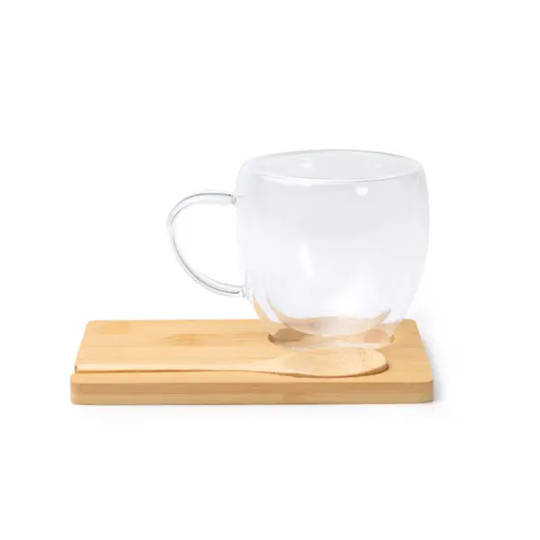 Set šalica od borosilikatnog stakla s dvostrukom stijenkom, bambusovom pladnjem i žlicom Kapacitet 250 ml Isporučuje se u eko dizajnerskoj kutiji