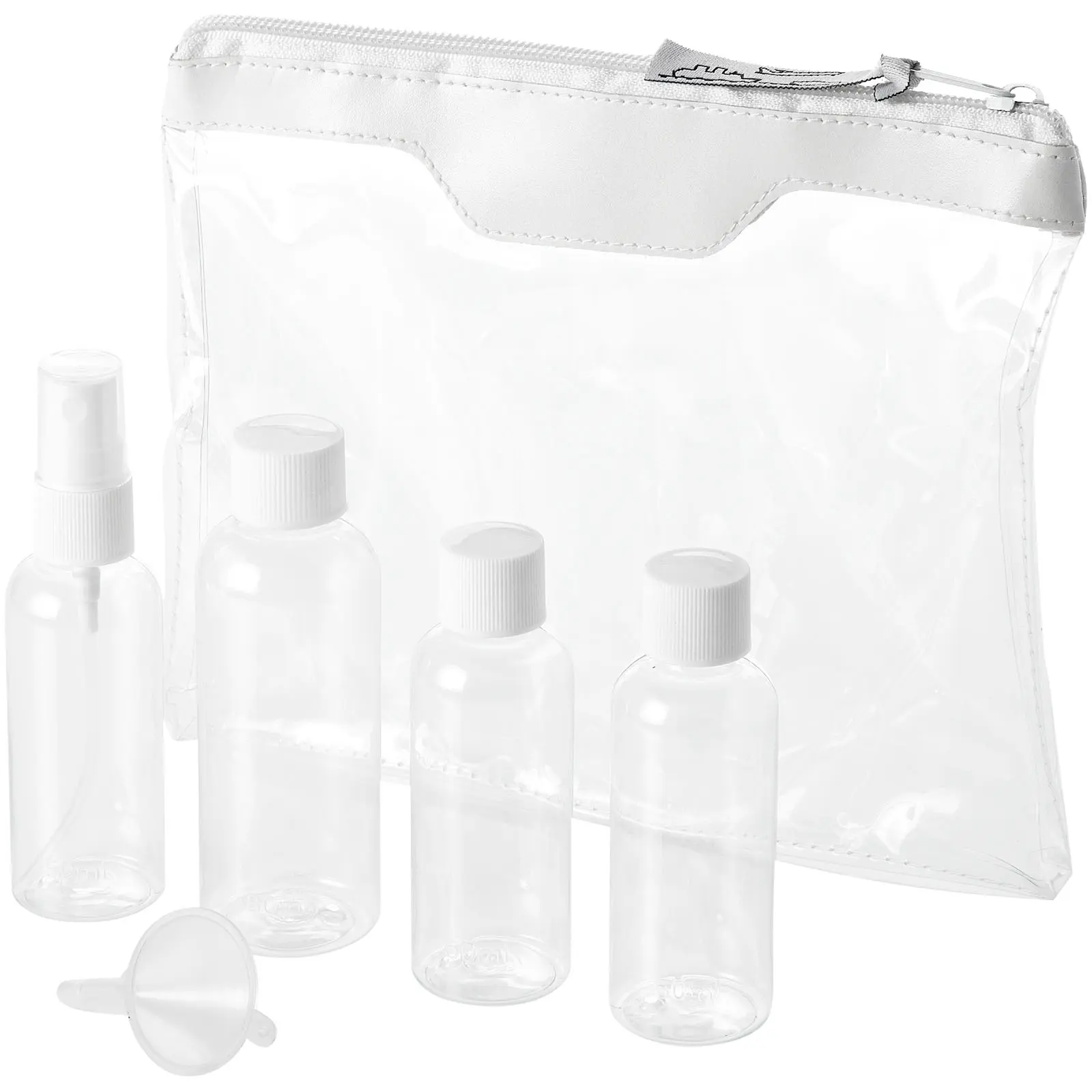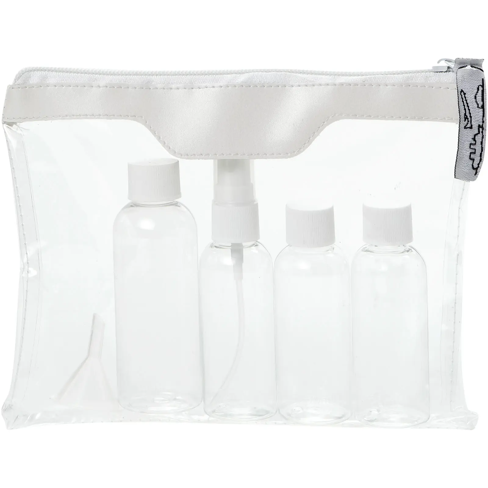 €2.50Putna kozmetička torbica odobrena za avion, uključuje 2 boce od 50 ml, 1 bocu od 90 ml, 1 raspršivač i lijevak, boce, raspršivač i lijevak pakirani u polietilenskoj vrećici, isporučuju se odvojeno od torbice, dekoracija nije dostupna na komponentama