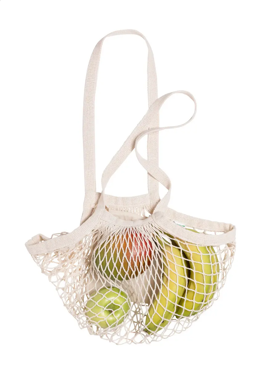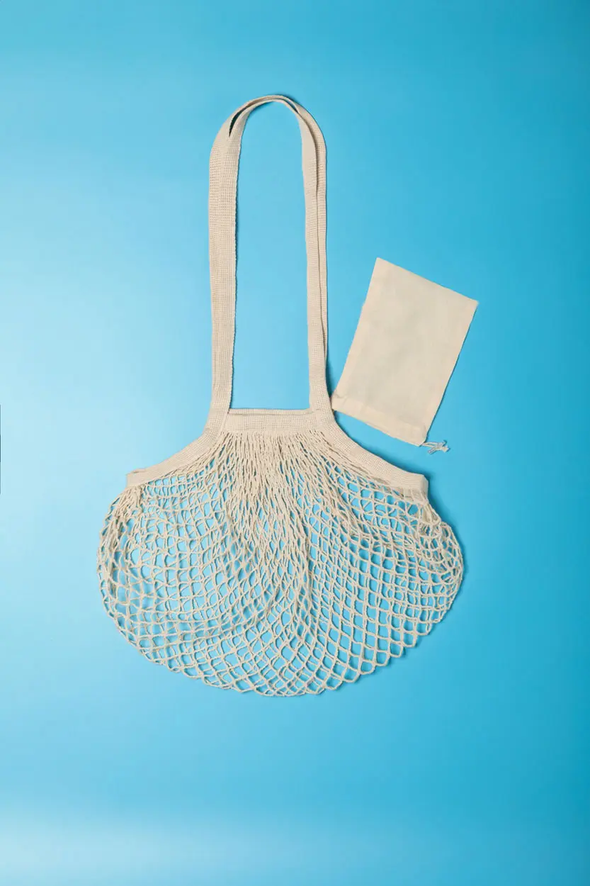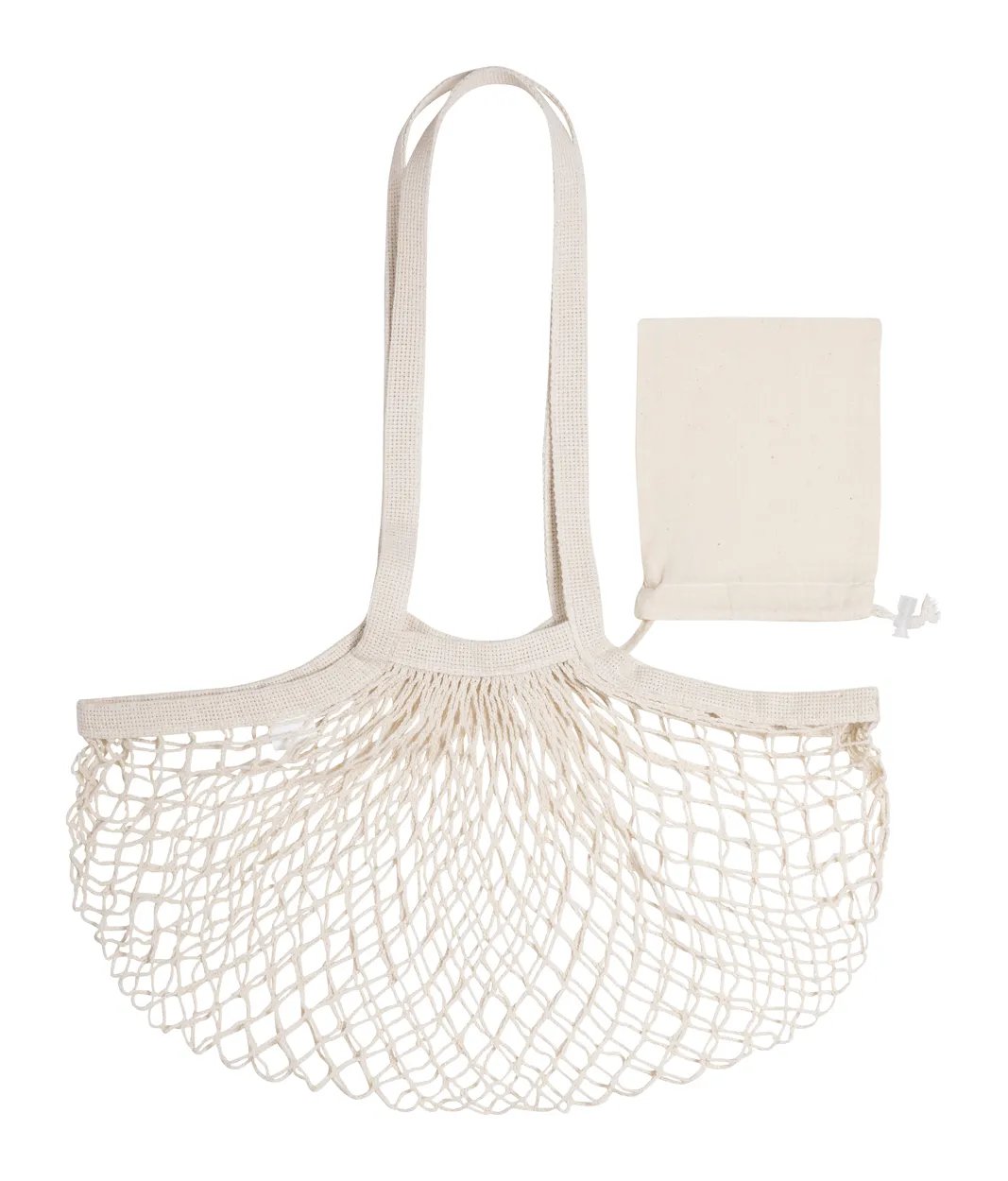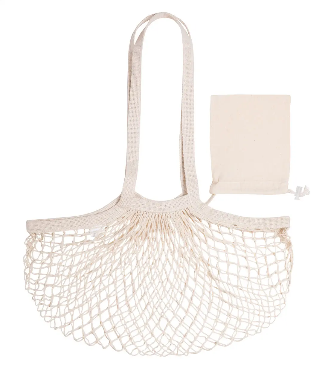 Mrežasta torba za kupovinu od 100% pamuka s dugim ručkama. Uključuje malu preklopnu torbicu s vezicom za zatvaranje.