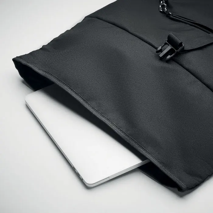 €10.68Rolltop ruksak od 600D RPET poliestera s podstavljenim leđima i ojačanim dnom prednji džep na patentni zatvarač podstava od 210D RPET