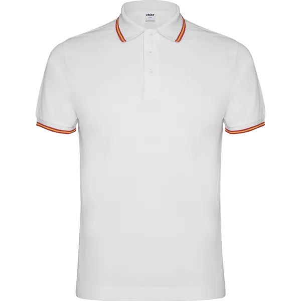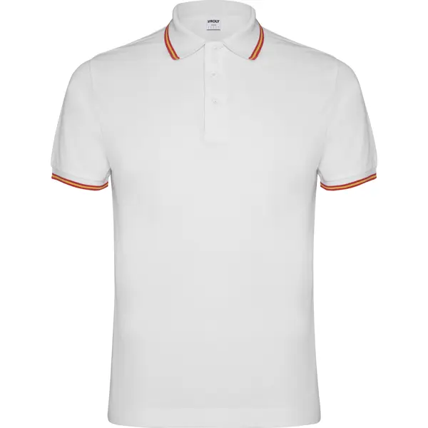 €8.14Polo majica kratkih rukava s tretmanom protiv grudanja. Piqué šav. Ovratnik i rukavi u kontrastnoj boji, 1x1 tkanje. Plaket s 3 gumba. Ojačani ovratnik u tkanini iste boje i unutarnja strana leđnog dijela. Detalj vezenog zastavice na leđima. Džep, opcionalno. Može se prati na 60 °C.