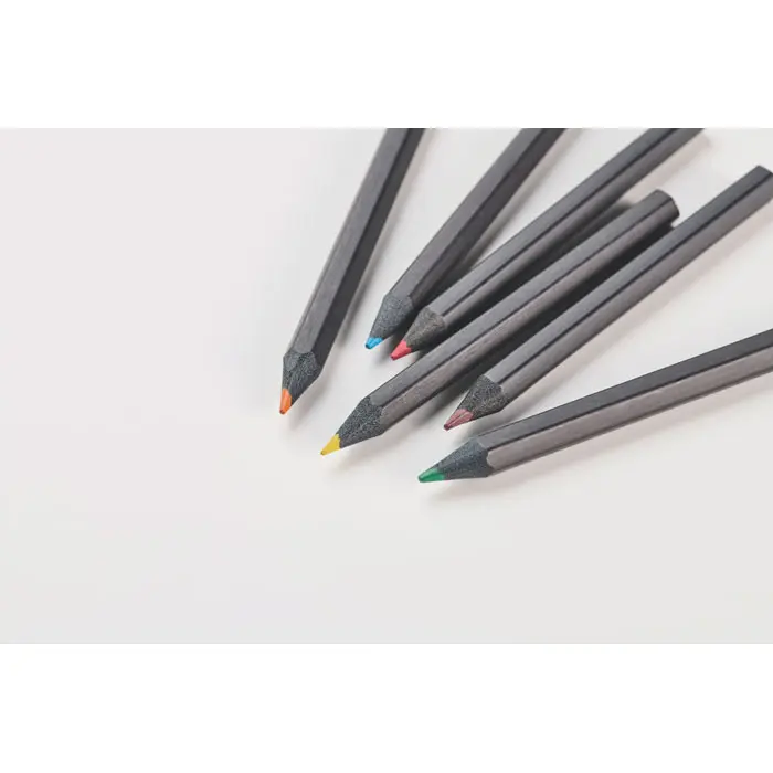 Crna papirnata kutija sadrži 6 bojica i šiljilo u poklopcu kutije