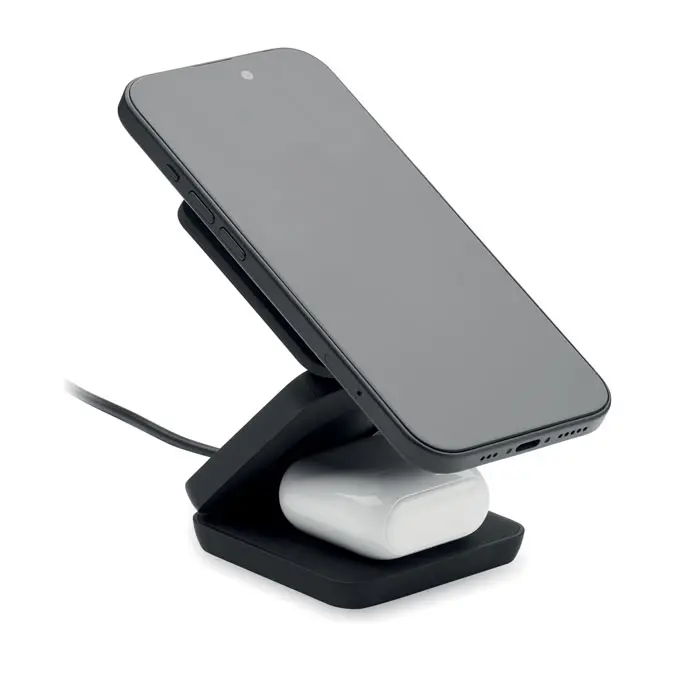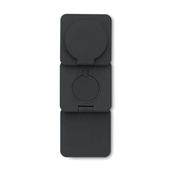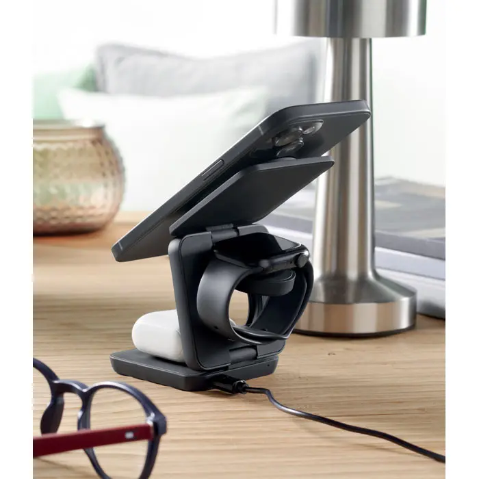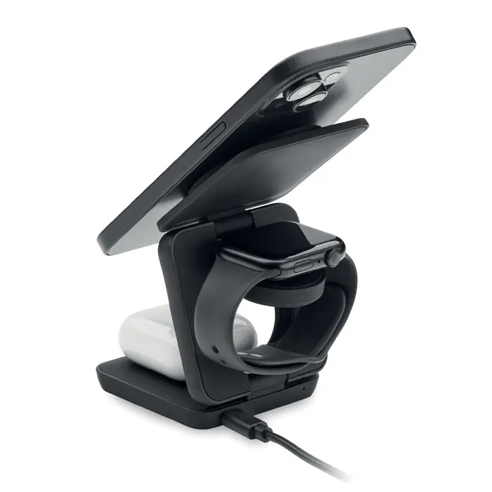 €18.753 u 1 sklopiva stanica za punjenje od gumeniziranog recikliranog ABS-a. Uključuje magnetski bežični punjač od 15W, punjač za pametni sat (samo za Apple®) i TWS punjač.
