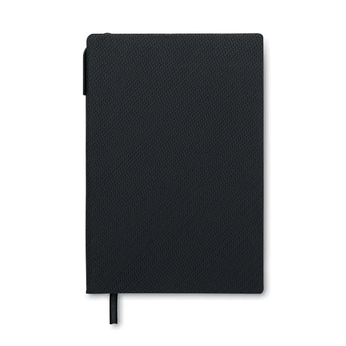 €2.67A5 bilježnica s teksturiranom PU koricom, ABS kemijska olovka s mehanizmom na okretanje u držaču na hrptu, uvezana, 160 liniranih stranica recikliranog papira (80 listova)