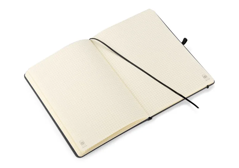Bilježnica GLITZO ima 80 karo stranica od recikliranog papira, kompaktnog je A5 formata i tvrde korice izrađene od recikliranog PU materijala. Proizvod se zatvara praktičnom elastičnom trakom za sigurno čuvanje bilješki, a vrpca koja služi kao oznaka za knjige omogućit će vam da lako pronađete gdje ste stali. Osim toga, bilježnica ima prostor za olovku, što je čini još funkcionalnijom.