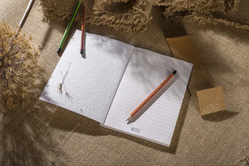 €4.99Bilježnica MARIGOLD je jedinstvena bilježnica s korice od pamuka i cvijeta nevena, koje sadrže sjemenke cvijeta koje čine 1 do 5% njene težine. Stranice su izrađene od papira na bazi pšenične slame od 80 gsm i unutra se nalazi 80 liniranih stranica. Bilježnica također ima odstranjivu oznaku za knjige od kraft papira.