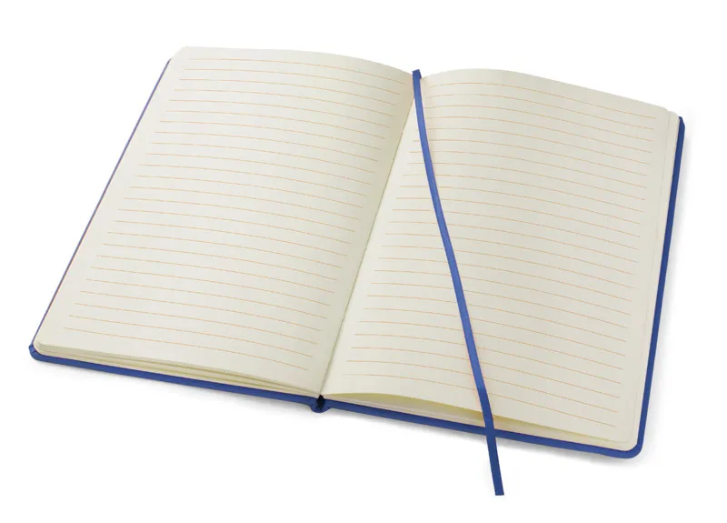 A5 bilježnica s gumicom u boji, izrađena od materijala nalik koži (PU), sadrži 80 ecru listova s narančastim crtama, mogućnost tiska logotipa na koricama