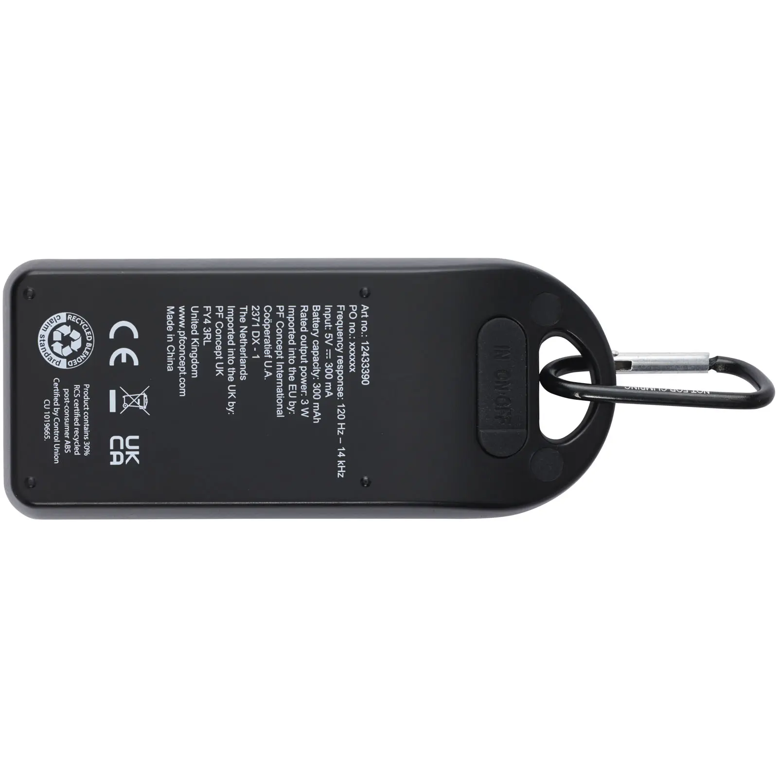 €10.35RCS reciklirani 3W Bluetooth® zvučnik reproducira glazbu, podcaste i drugo s bilo kojeg Bluetooth® uređaja, uz mogućnost jednostavnog pričvršćivanja na ruksak zahvaljujući priloženom karabineru, IPX4 zaštita od povremene kiše, do 1,5 sati reprodukcije pri maksimalnoj glasnoći zbog baterije od 300 mAh Li-ion, vrijeme punjenja 1,5 sat, Bluetooth® 5.0 s dometom do 10 metara, isporučuje se s uputama za uporabu, karabinerom, USB-A na Type-C kabelom za punjenje duljine 50 cm, pakiran u kutiju od 100% recikliranog kraft papira