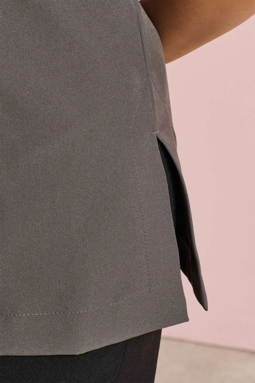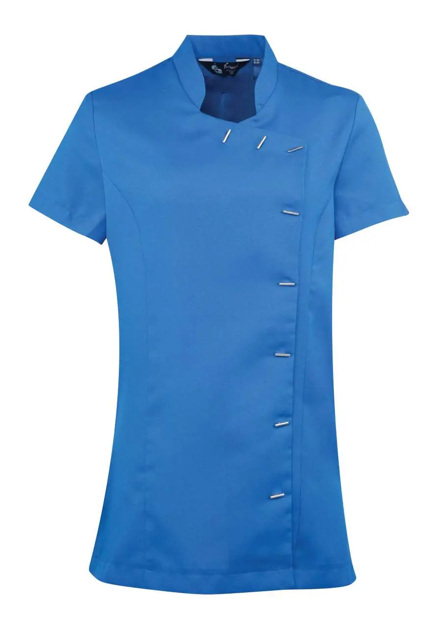 Materijal 100% Poliester ravno tkanje 185gsm Karakteristike Tunika za ljepotu i spa s Mandarin ovratnikom Asimetrično kopčanje na prednjoj strani s osam 'bar' oblikovanih gumba Bočni prorezi Zadnji nabor za lakše kretanje Princeza šavovi