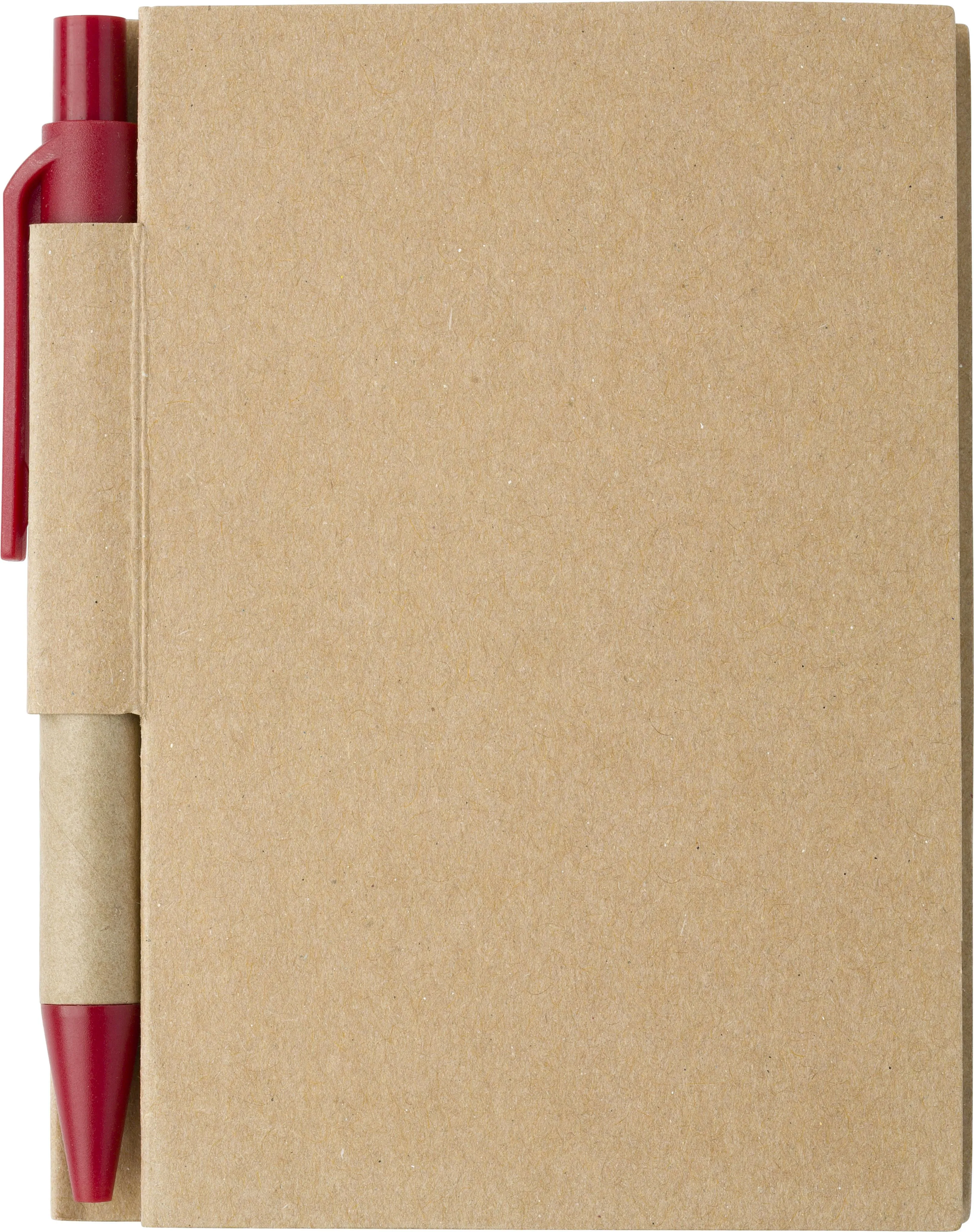 Kartonska bilježnica s 80 obloženih stranica, držačem za olovku i kemijskom olovkom s crnim uloškom.
