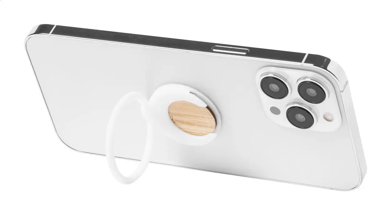 Kružni držač za mobitel od ABS plastike s samoljepljivom bazom i kovanicom za kolica od bambusa.