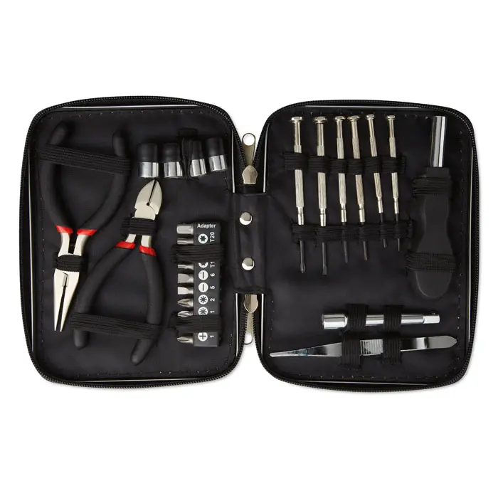Set alata u aluminijskoj kutiji sadrži kliješta za nos, kliješta za rezanje, odvijač s nastavcima, produžetak, set od 10 bitova, pincetu i 6 preciznih odvijača