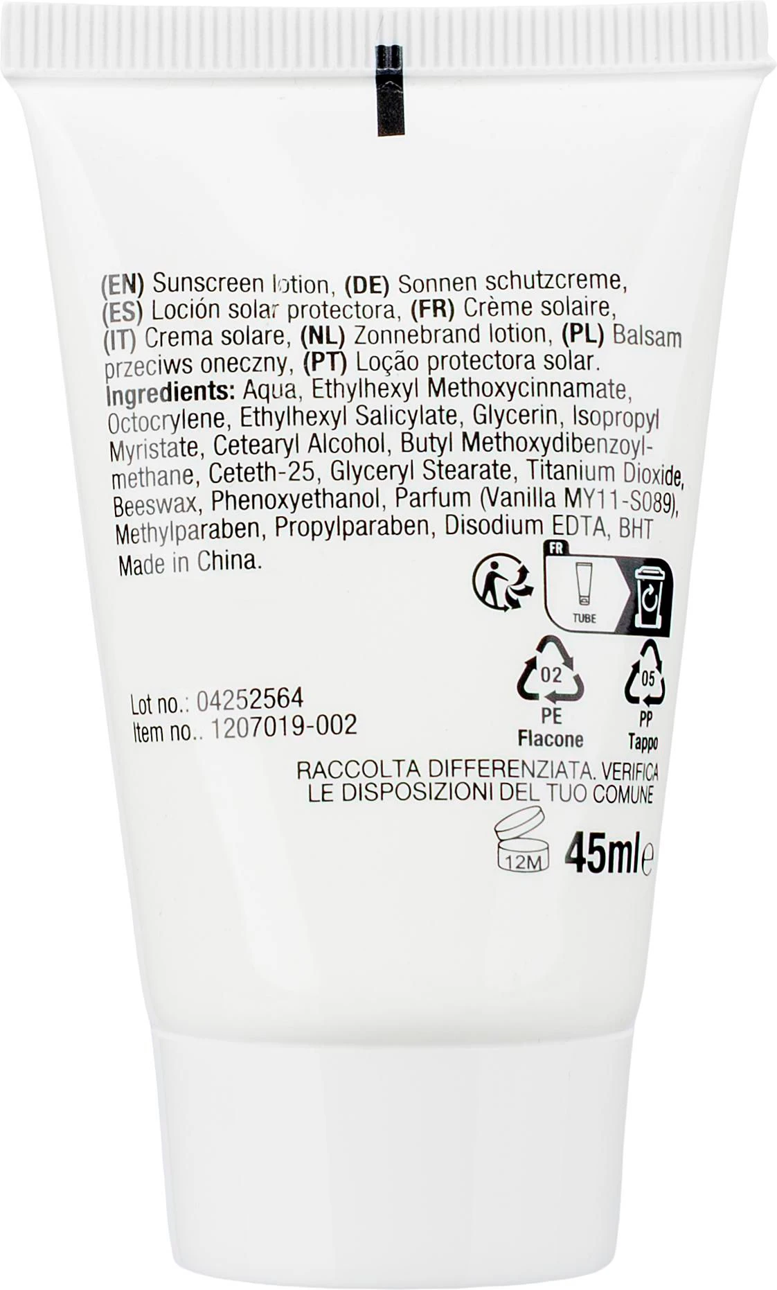 €1.14PE tuba za sunčanu kremu napunjena s 45 ml SPF30 kreme za sunčanje s mirisom vanilije. Dermatološki testirano s rokom trajanja do 3 godine nakon datuma proizvodnje.