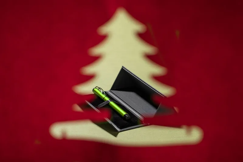 €3.28Etui za pisaći pribor u trokutastom obliku s magnetskim zatvaranjem, unutrašnjost obložena mekanim velurom, s trakicom za jednostavno vađenje pribora, kapacitet za jednu do dvije olovke ili kemijske olovke, izrađen od ekološkog papira