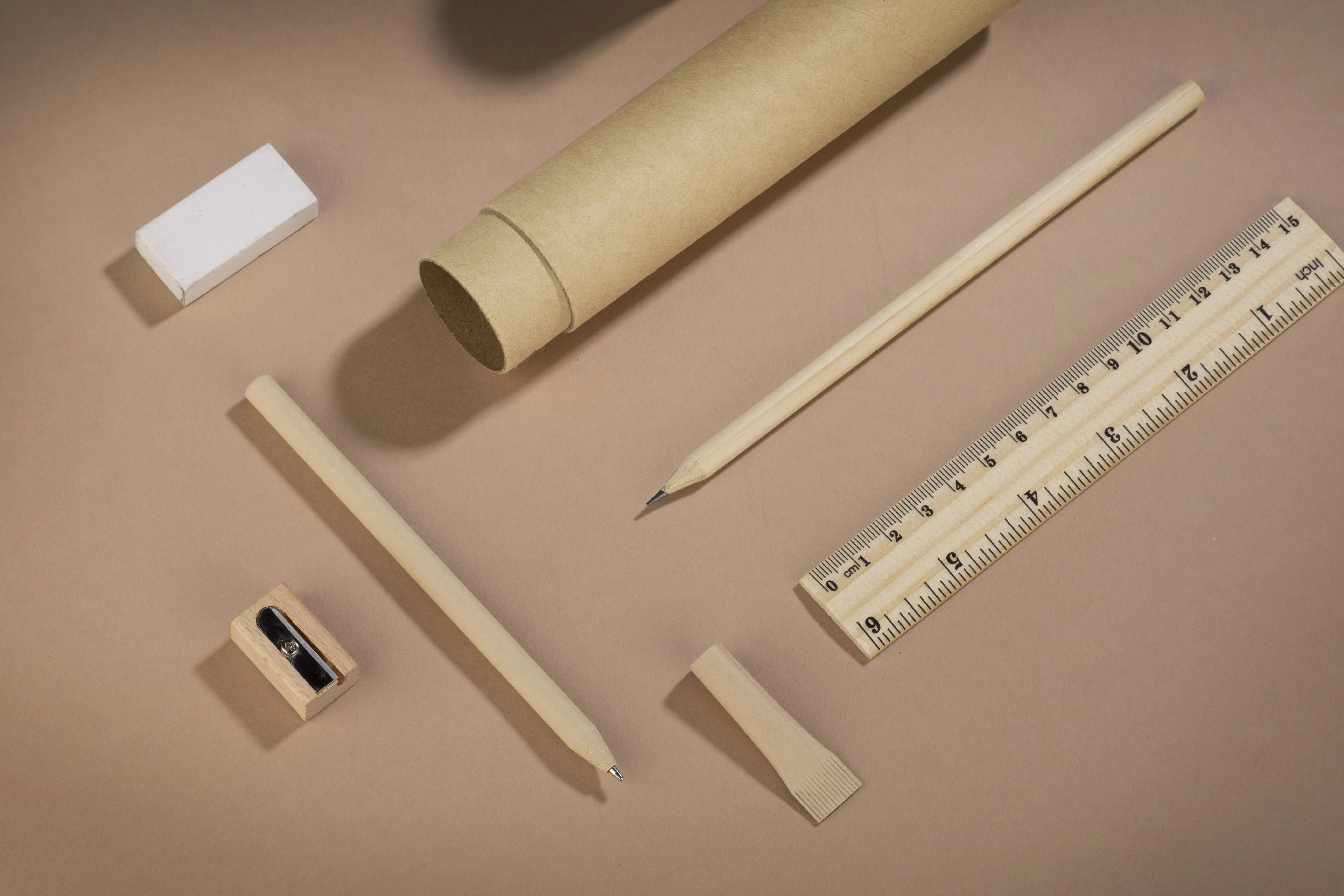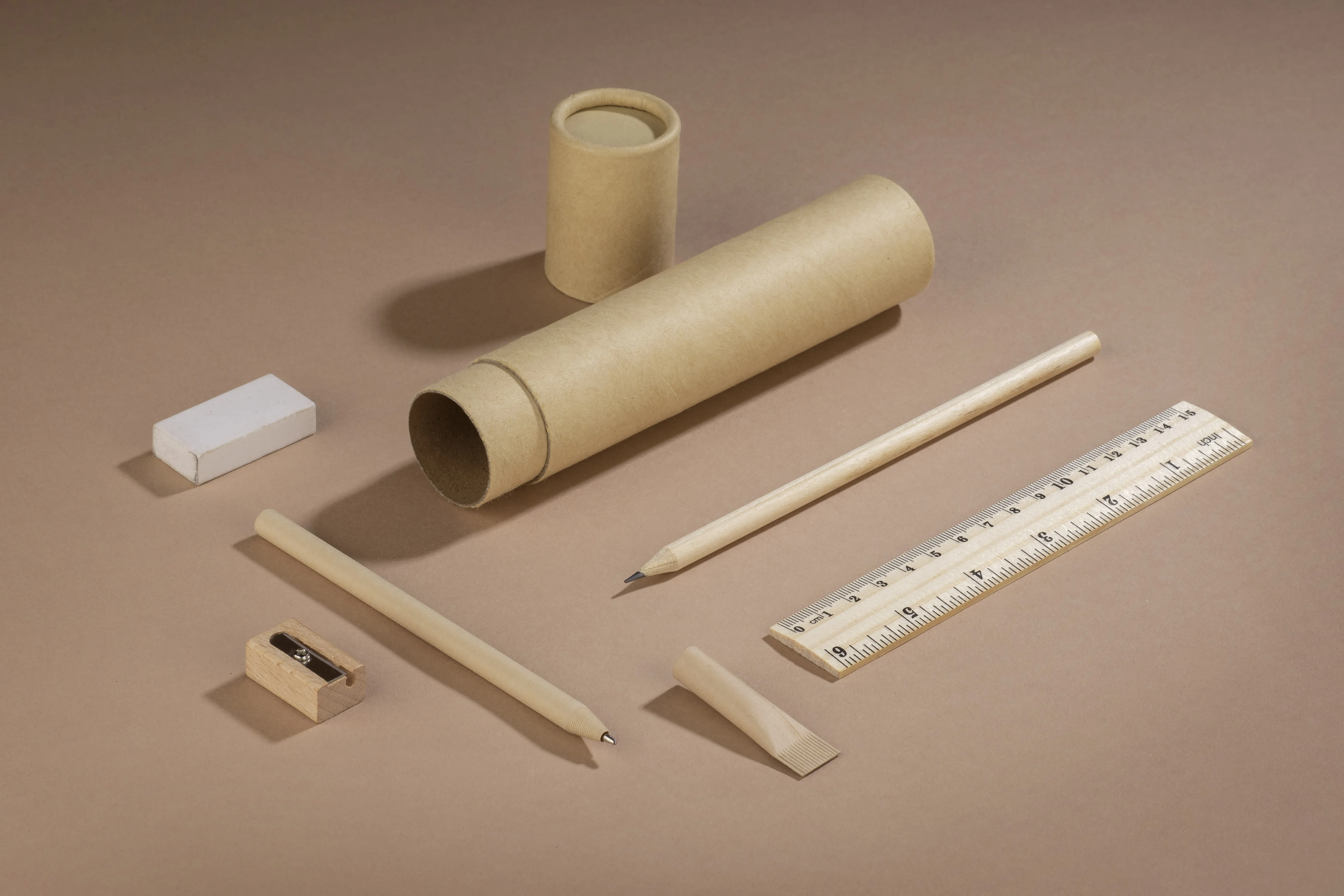 €2.37Ekološka pernica izrađena od cjevastog kraft papira. Set uključuje: papirnatu olovku i drvene: olovku, šiljilo, ravnalo i gumicu.
