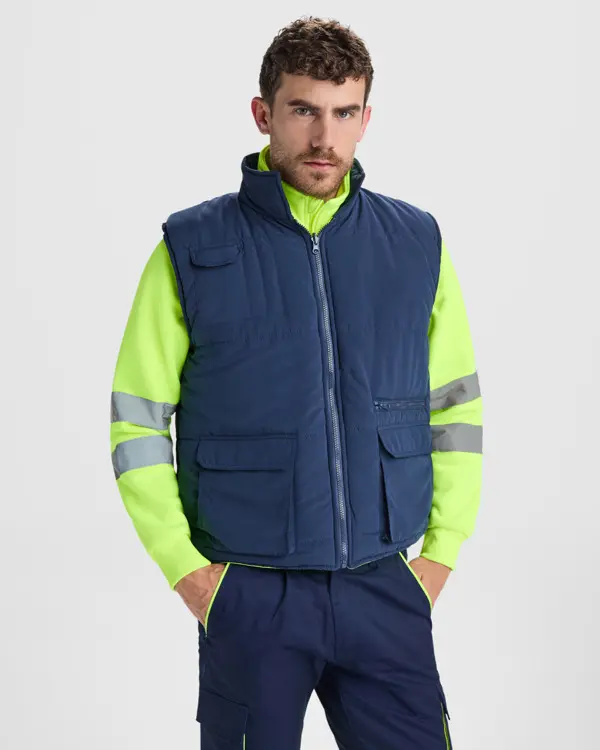 €19.06Dvostrani podstavljeni prsluk visoke vidljivosti s produženim leđima i više džepova, vanjska tkanina tamnoplava, unutarnja fluorescentno žuta s reflektirajućim trakama, dva prednja džepa s dvostrukim pristupom (bočno i odozgo) s naborom i preklopom, višenamjenski prsni džep, prednji patentni zatvarač s obostranim povlačenjem, elastične podesive rupice za ruke, elastični dijelovi u struku, produženi stražnji rub, vanjska Roly WRK etiketa, do 25 ciklusa pranja