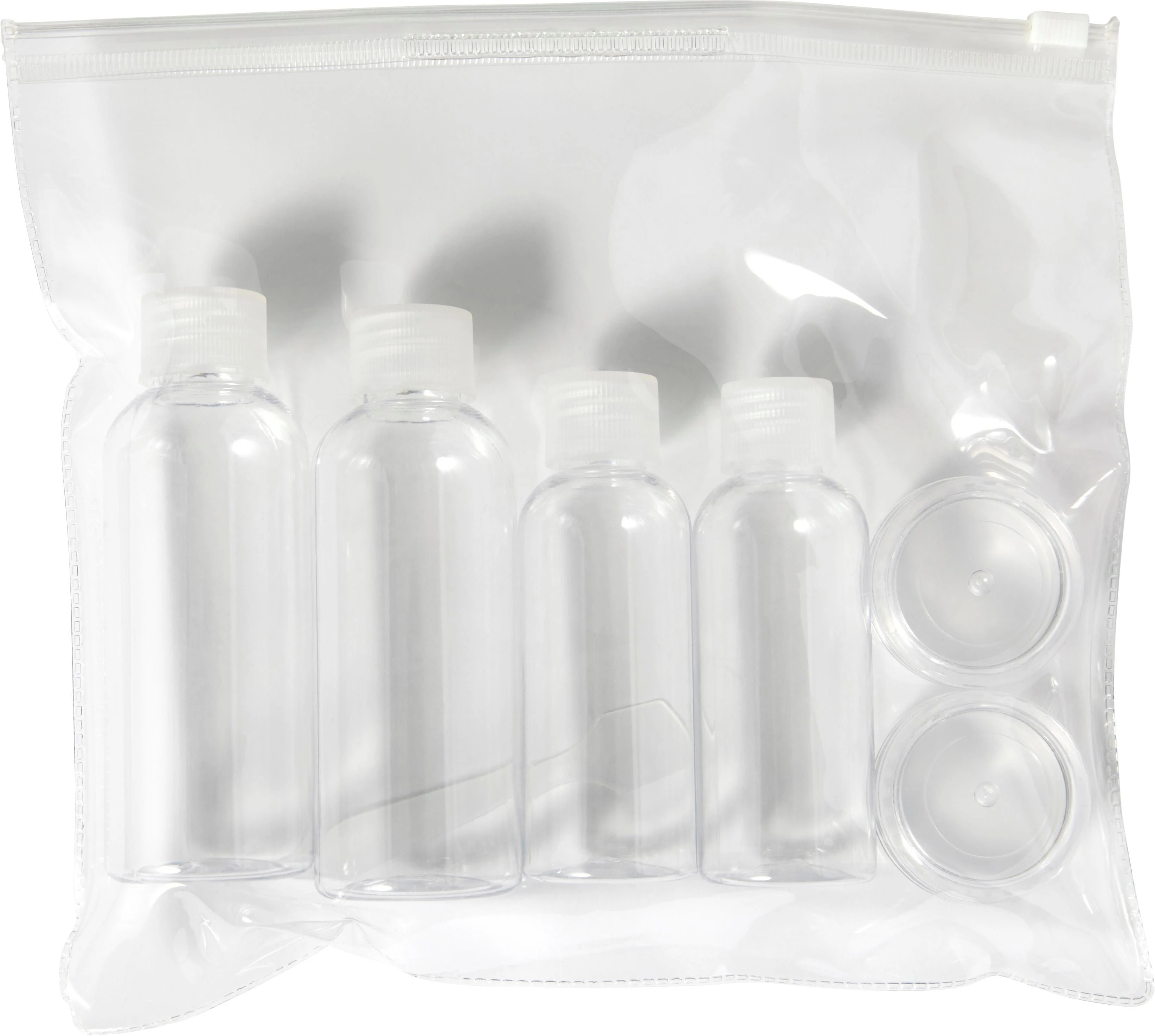 €2.65PETG putni set sadrži dvije boce od 100 ml, dvije boce od 50 ml, dva spremnika od 10 ml i malu špatulu